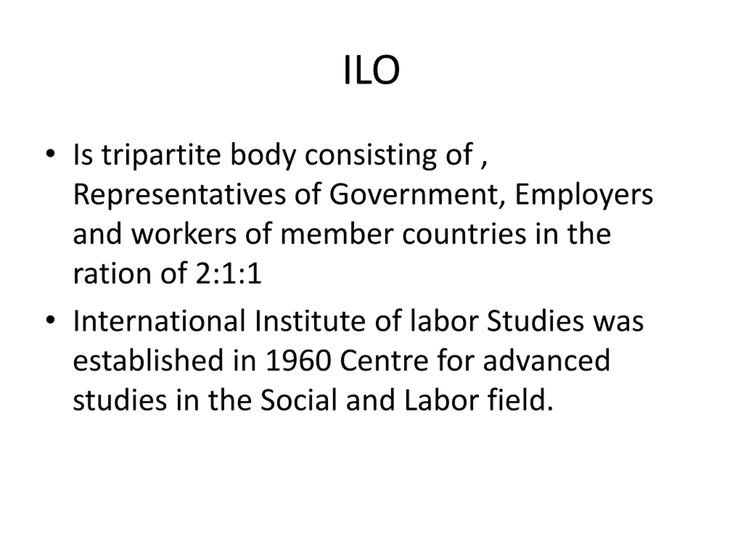 ILO Is tripartite body consisting of , Representatives of Government, Employers and workers of member countries in the ration of 2:1:1 International Institute of labor Studies was established in 1960 Centre for advanced studies in the Social and Labor field.