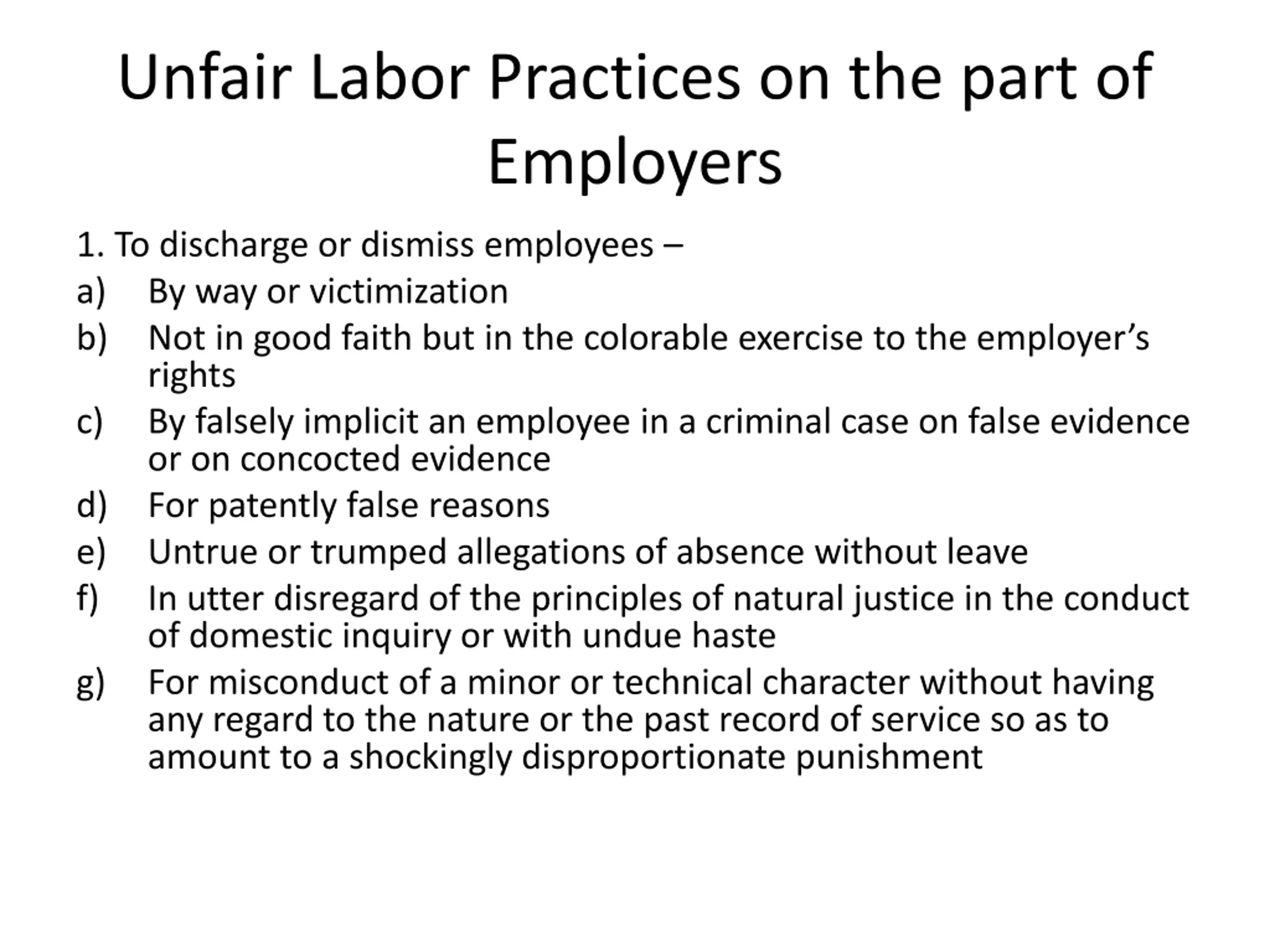 Unfair Labor Practices on the part of Employers 1. To discharge or dismiss employees a) By way or victimization b) Not in good faith but in the colorable exercise to the employer s rights c) By falsely implicit an employee in a criminal case on false evidence or on concocted evidence d) For patently false reasons e) Untrue or trumped allegations of absence without leave f) In utter disregard of the principles of natural justice in the conduct of domestic inquiry or with undue haste g) For misconduct of a minor or technical character without having any regard to the nature or the past record of service so as to amount to a shockingly disproportionate punishment