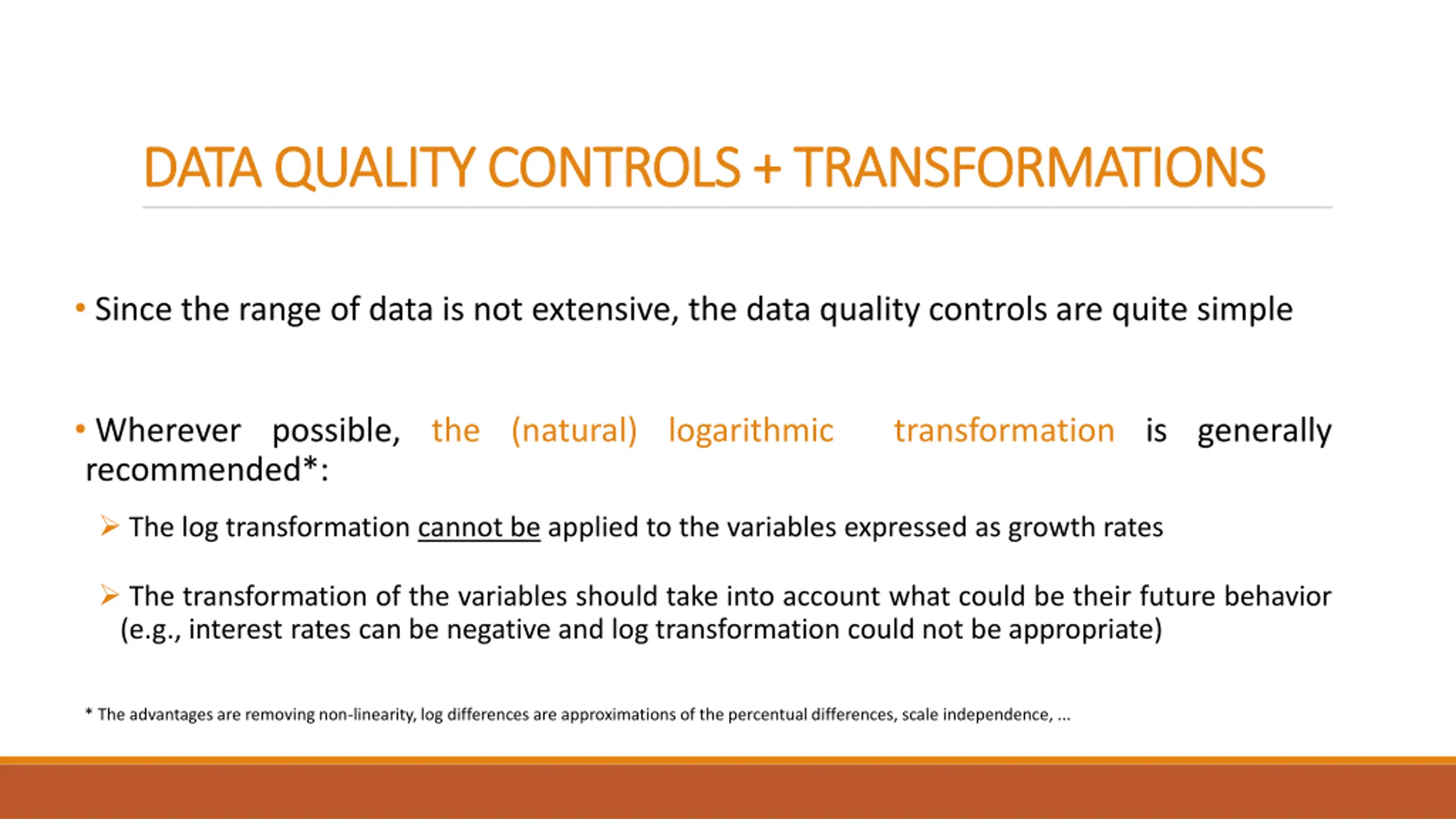 DATA QUALITY CONTROLS + TRANSFORMATIONS DATA QUALITY CONTROLS + TRANSFORMATIONS Since the range of data is not extensive, the data quality controls are quite simple Wherever possible, the (natural) logarithmic transformation is generally recommended*: The log transformation cannot be applied to the variables expressed as growth rates The transformation of the variables should take into account what could be their future behavior (e.g., interest rates can be negative and log transformation could not be appropriate) * The advantages are removing non-linearity, log differences are approximations of the percentual differences, scale independence, ...