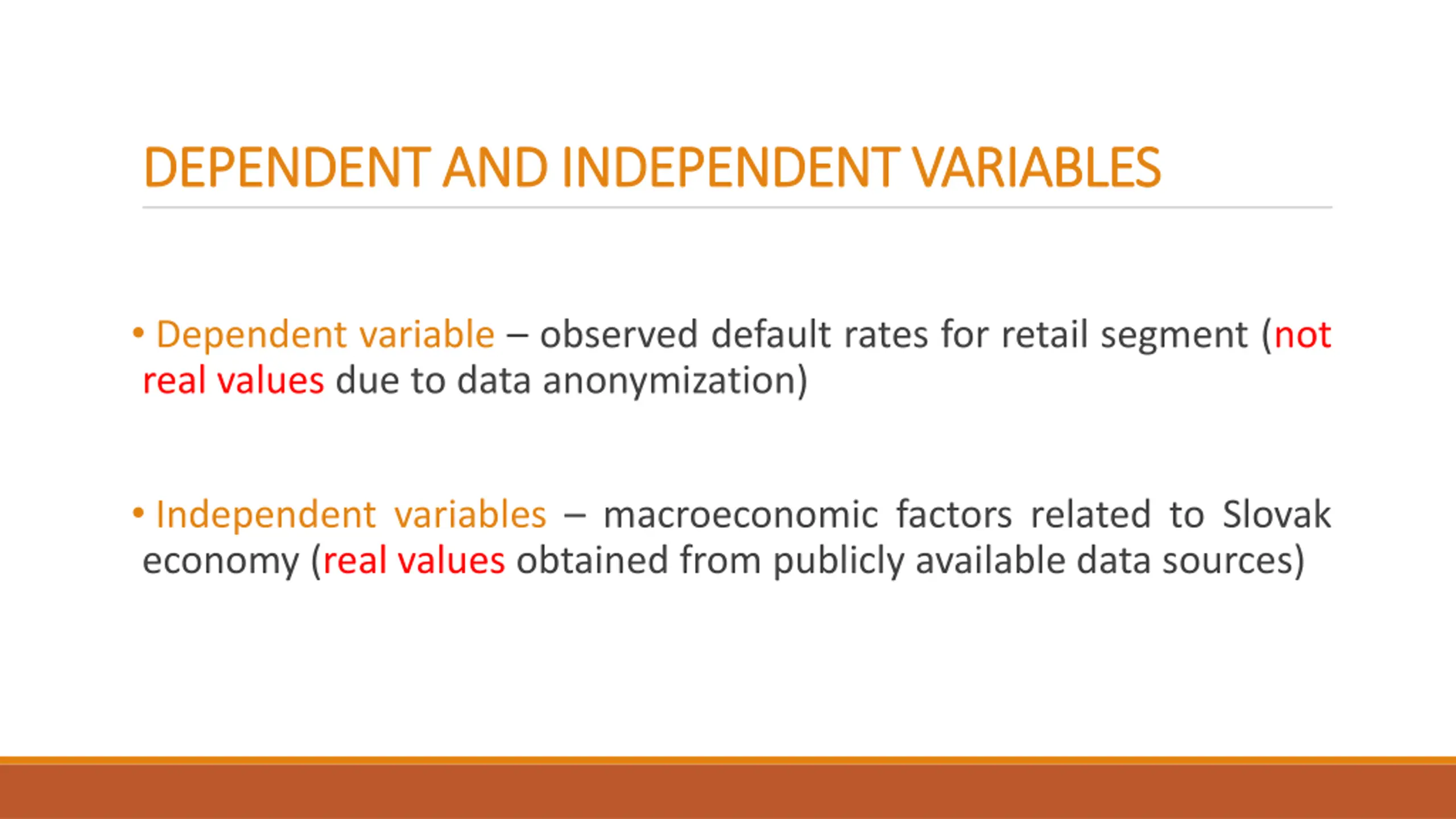 DEPENDENT AND INDEPENDENT VARIABLES DEPENDENT AND INDEPENDENT VARIABLES Dependent variable observed default rates for retail segment (not real values due to data anonymization) Independent variables macroeconomic factors related to Slovak economy (real values obtained from publicly available data sources)