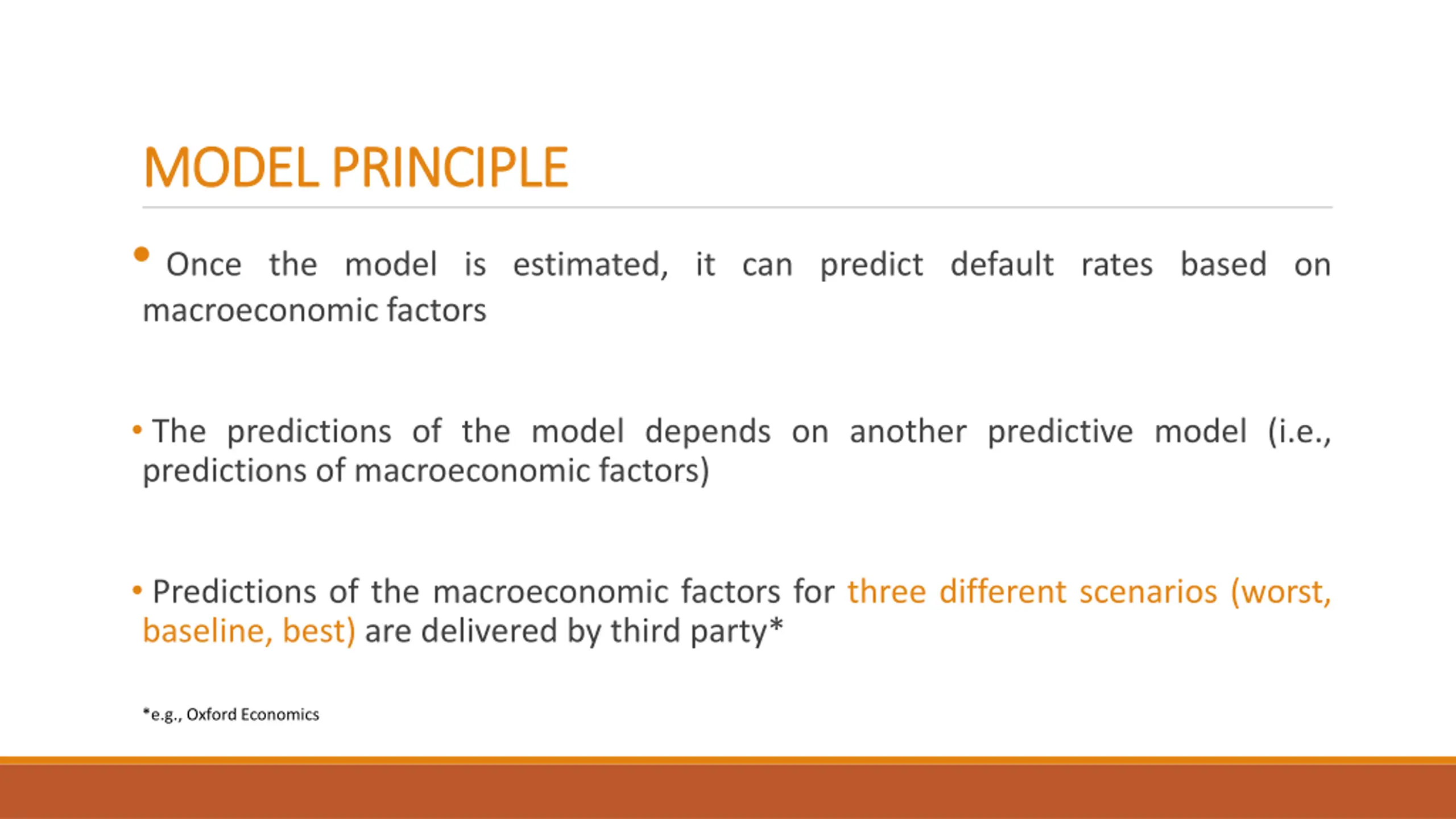 MODEL PRINCIPLE MODEL PRINCIPLE Once the model is estimated, it can predict default rates based on macroeconomic factors The predictions of the model depends on another predictive model (i.e., predictions of macroeconomic factors) Predictions of the macroeconomic factors for three different scenarios (worst, baseline, best) are delivered by third party* *e.g., Oxford Economics