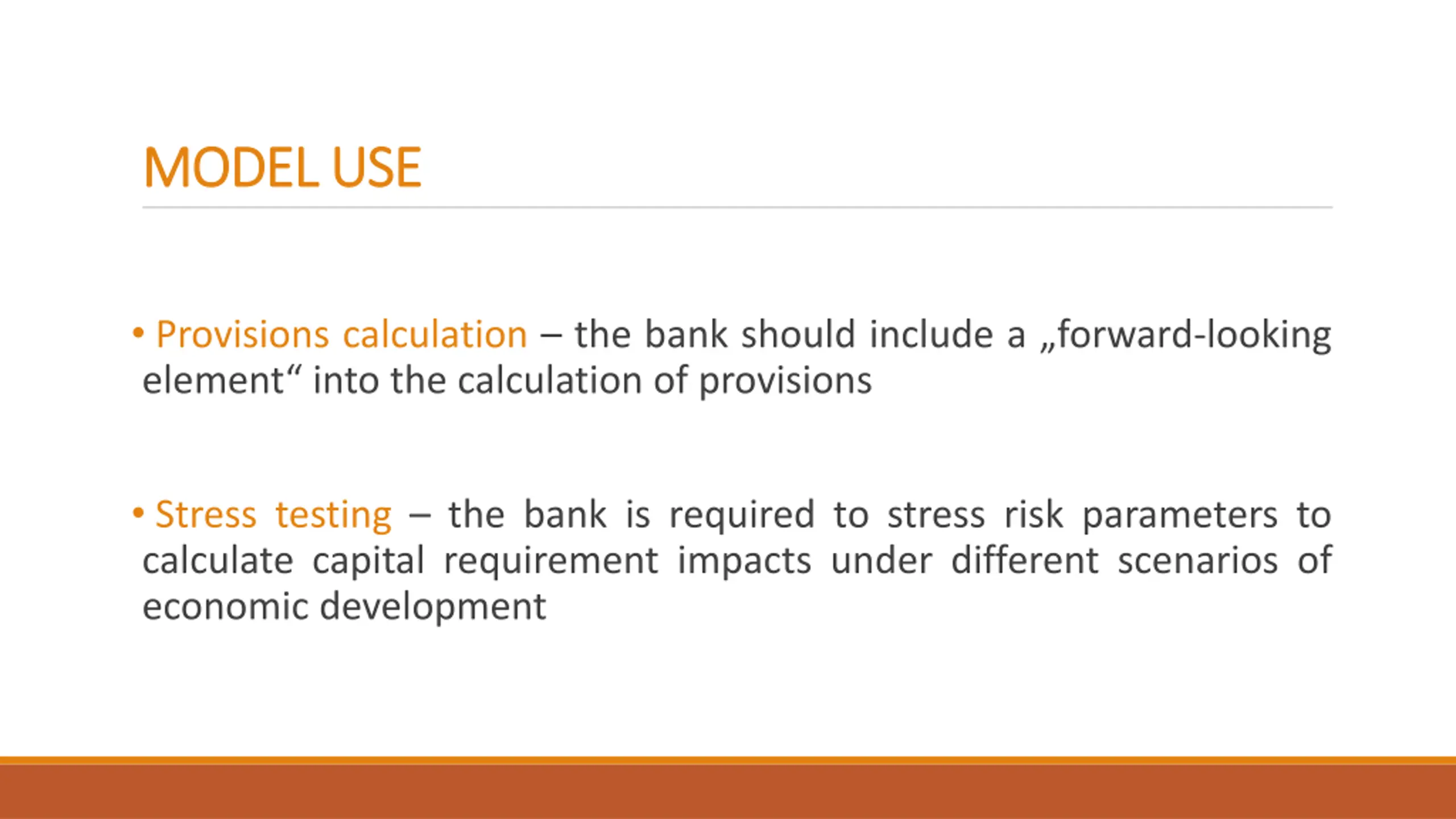 MODEL USE MODEL USE Provisions calculation the bank should include a forward-looking element into the calculation of provisions Stress testing the bank is required to stress risk parameters to calculate capital requirement impacts under different scenarios of economic development