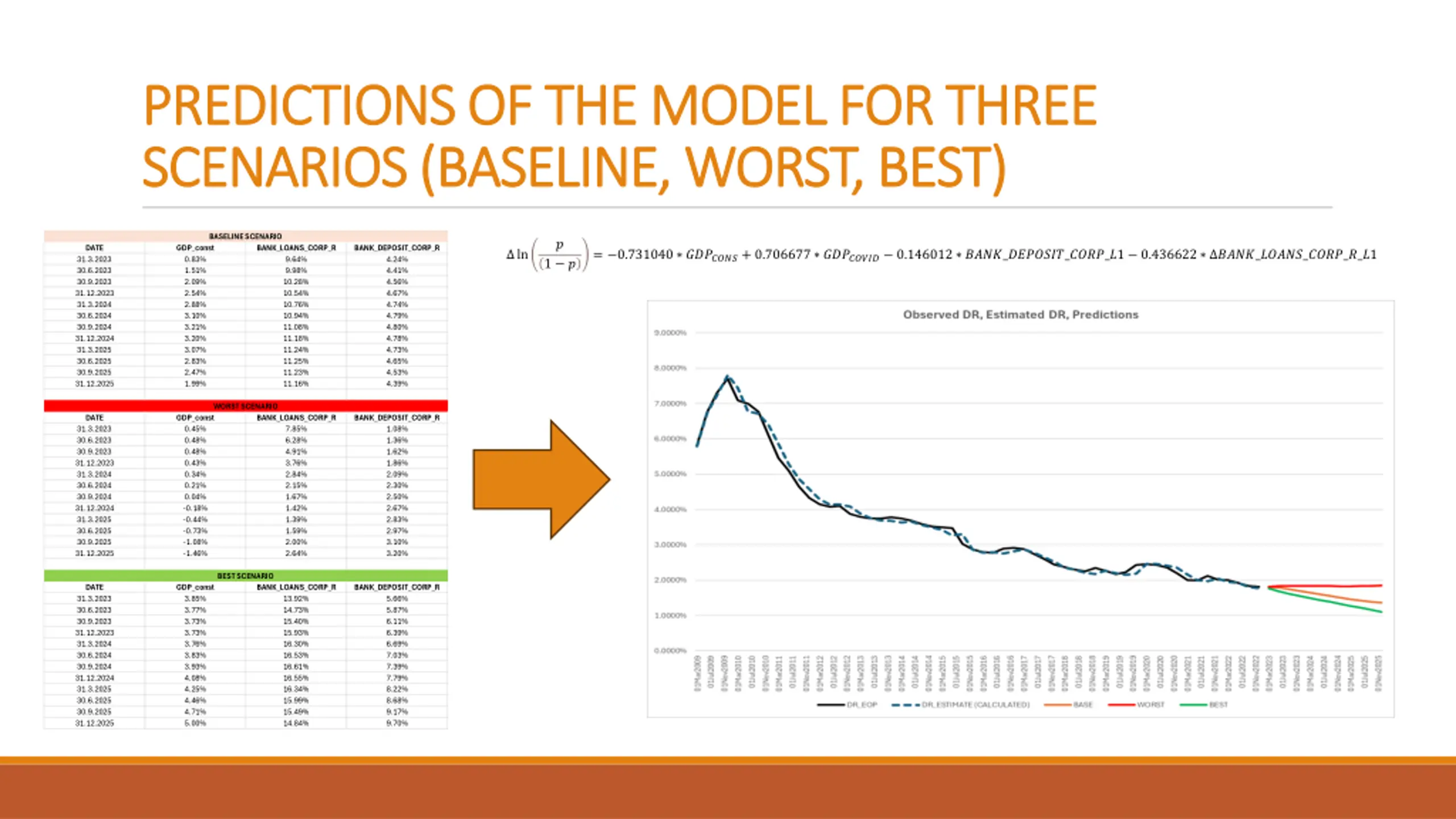 PREDICTIONS OF THE MODEL FOR THREE PREDICTIONS OF THE MODEL FOR THREE SCENARIOS (BASELINE, WORST, BEST) SCENARIOS (BASELINE, WORST, BEST) BASELINE SCENARIO ? DATE 31.3.2023 30.6.2023 30.9.2023 31.12.2023 31.3.2024 30.6.2024 30.9.2024 31.12.2024 31.3.2025 30.6.2025 30.9.2025 31.12.2025 GDP_const 0.83% 1.51% 2.09% 2.54% 2.88% 3.10% 3.21% 3.20% 3.07% 2.83% 2.47% 1.99% BANK_LOANS_CORP_R 9.64% 9.98% 10.28% 10.54% 10.76% 10.94% 11.08% 11.18% 11.24% 11.25% 11.23% 11.16% BANK_DEPOSIT_CORP_R 4.24% 4.41% 4.56% 4.67% 4.74% 4.79% 4.80% 4.78% 4.73% 4.65% 4.53% 4.39% ln = 0.731040 ???????+ 0.706677 ???????? 0.146012 ????_???????_????_?1 0.436622 ????_?????_????_?_?1 1 ? WORST SCENARIO DATE 31.3.2023 30.6.2023 30.9.2023 31.12.2023 31.3.2024 30.6.2024 30.9.2024 31.12.2024 31.3.2025 30.6.2025 30.9.2025 31.12.2025 GDP_const 0.45% 0.48% 0.48% 0.43% 0.34% 0.21% 0.04% -0.18% -0.44% -0.73% -1.08% -1.46% BANK_LOANS_CORP_R 7.85% 6.28% 4.91% 3.76% 2.84% 2.15% 1.67% 1.42% 1.39% 1.59% 2.00% 2.64% BANK_DEPOSIT_CORP_R 1.08% 1.36% 1.62% 1.86% 2.09% 2.30% 2.50% 2.67% 2.83% 2.97% 3.10% 3.20% BEST SCENARIO DATE 31.3.2023 30.6.2023 30.9.2023 31.12.2023 31.3.2024 30.6.2024 30.9.2024 31.12.2024 31.3.2025 30.6.2025 30.9.2025 31.12.2025 GDP_const 3.85% 3.77% 3.73% 3.73% 3.76% 3.83% 3.93% 4.08% 4.25% 4.46% 4.71% 5.00% BANK_LOANS_CORP_R 13.92% 14.73% 15.40% 15.93% 16.30% 16.53% 16.61% 16.55% 16.34% 15.99% 15.49% 14.84% BANK_DEPOSIT_CORP_R 5.66% 5.87% 6.11% 6.39% 6.69% 7.03% 7.39% 7.79% 8.22% 8.68% 9.17% 9.70%