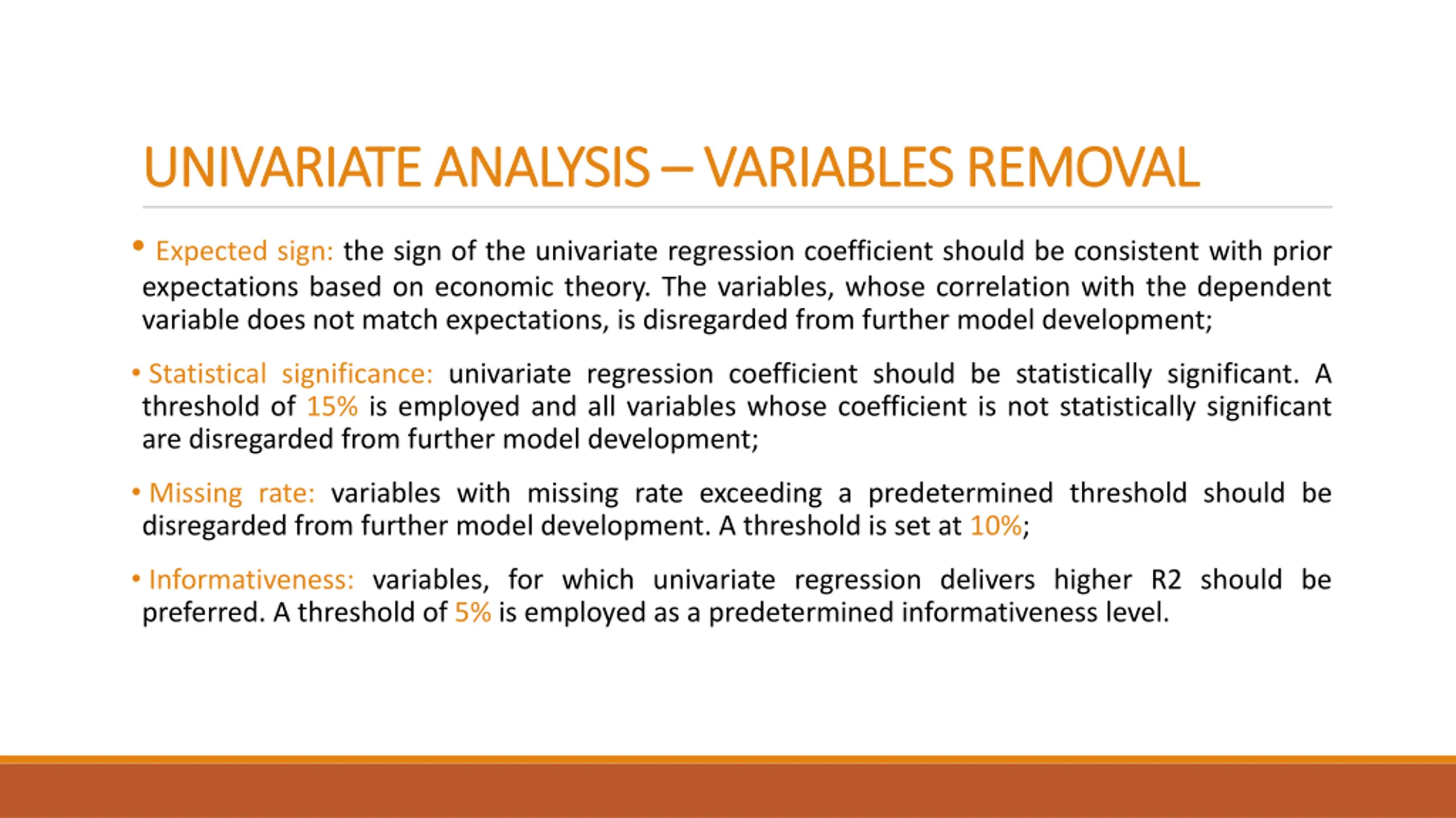 UNIVARIATE ANALYSIS UNIVARIATE ANALYSIS VARIABLES REMOVAL Expected sign: the sign of the univariate regression coefficient should be consistent with prior expectations based on economic theory. The variables, whose correlation with the dependent variable does not match expectations, is disregarded from further model development; VARIABLES REMOVAL Statistical significance: univariate regression coefficient should be statistically significant. A threshold of 15% is employed and all variables whose coefficient is not statistically significant are disregarded from further model development; Missing rate: variables with missing rate exceeding a predetermined threshold should be disregarded from further model development. A threshold is set at 10%; Informativeness: variables, for which univariate regression delivers higher R2 should be preferred. A threshold of 5% is employed as a predetermined informativeness level.