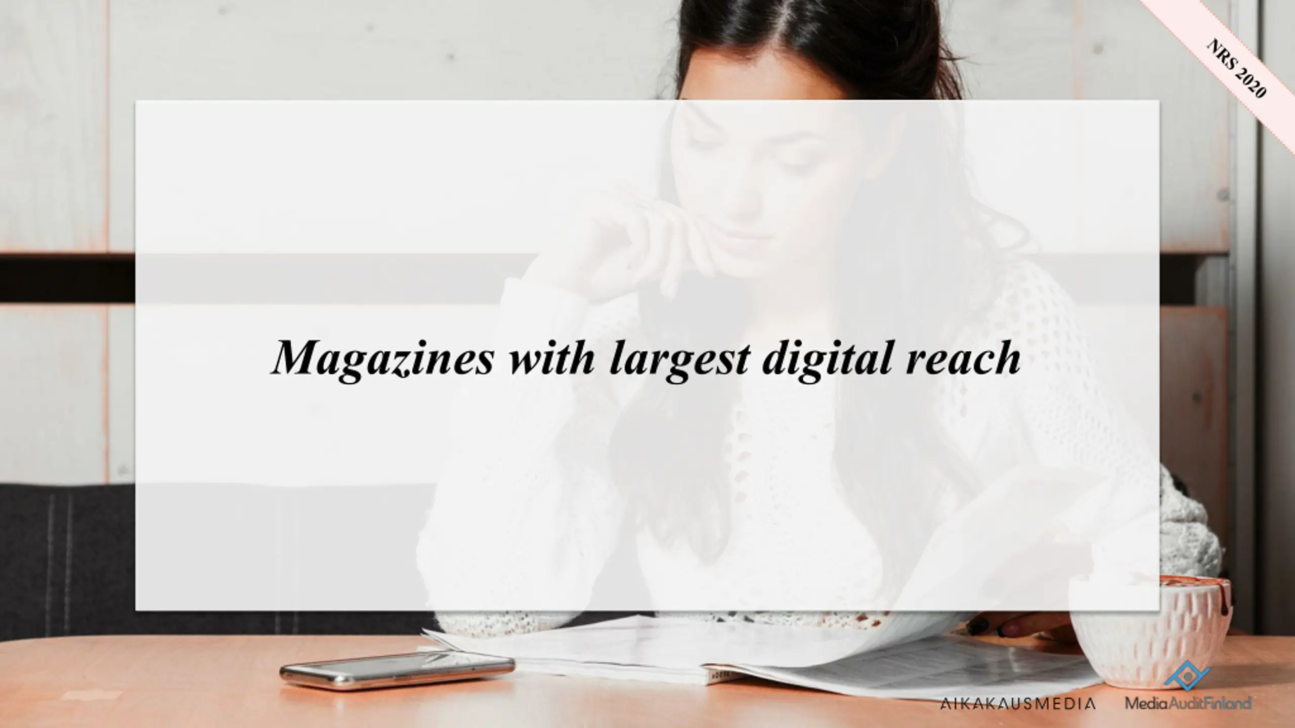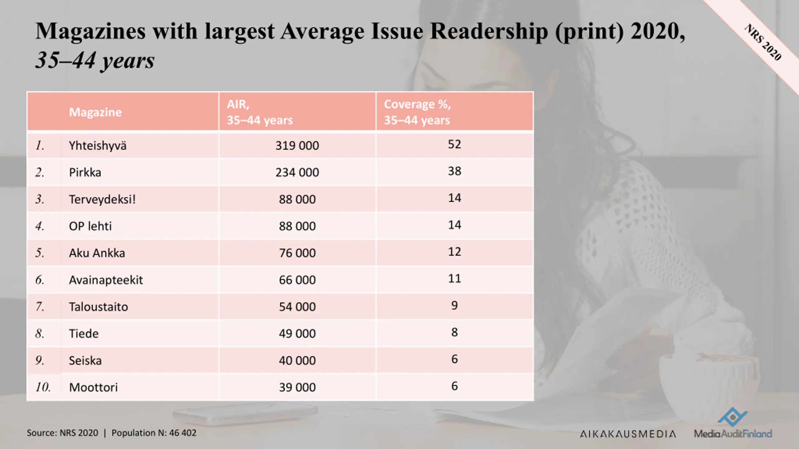 Magazinesi with largest digital weekly reach 2020, 35 44 years Digital weekly reach, 35 44 years Coverage %, 35 44 years Magazine 1. 51 Me Naiset 317 000 2. 41 Seiska 254 000 3. 15 Talousel m 94 000 4. 15 Tekniikan Maailma 93 000 5. 15 Anna 93 000 6. 13 Kotiliesi 83 000 7. 7 Tekniikka & Talous 45 000 8. 7 Kodin Kuvalehti 42 000 9. 7 Tivi 41 000 10. 7 Mikrobitti 41 000 Source: NRS 2020 | Population N: 46 402