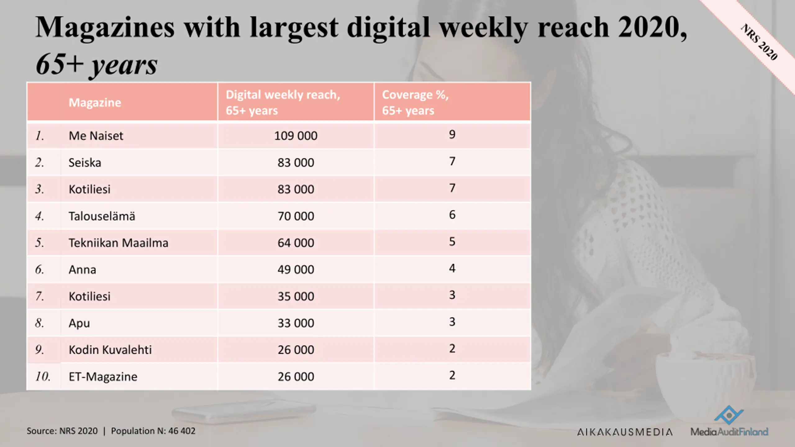 Magazines with largest digital weekly reach 2020, 65+ years Digital weekly reach, 65+ years Coverage %, 65+ years Magazine 1. 9 Me Naiset 109 000 2. 7 Seiska 83 000 3. 7 Kotiliesi 83 000 4. 6 Talousel m 70 000 5. 5 Tekniikan Maailma 64 000 6. 4 Anna 49 000 7. 3 Kotiliesi 35 000 8. 3 Apu 33 000 9. 2 Kodin Kuvalehti 26 000 10. 2 ET-Magazine 26 000 Source: NRS 2020 | Population N: 46 402