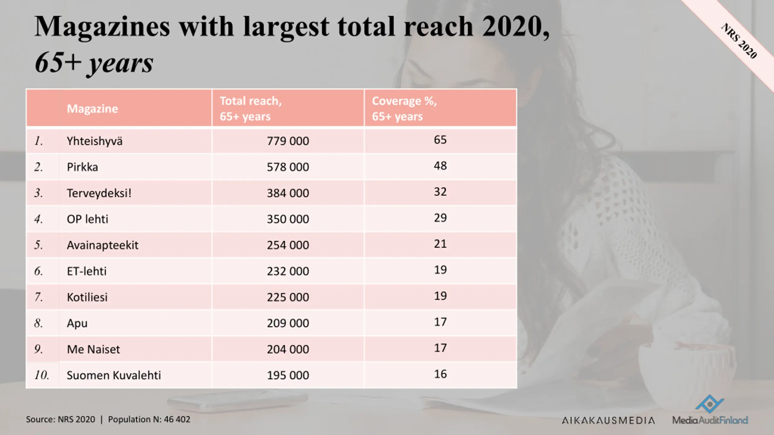 Magazines with largest total reach 2020, 65+ years Total reach, 65+ years Coverage %, 65+ years Magazine 1. 65 Yhteishyv 779 000 2. 48 Pirkka 578 000 3. 32 Terveydeksi! 384 000 4. 29 OP lehti 350 000 5. 21 Avainapteekit 254 000 6. 19 ET-lehti 232 000 7. 19 Kotiliesi 225 000 8. 17 Apu 209 000 9. 17 Me Naiset 204 000 10. 16 Suomen Kuvalehti 195 000 Source: NRS 2020 | Population N: 46 402