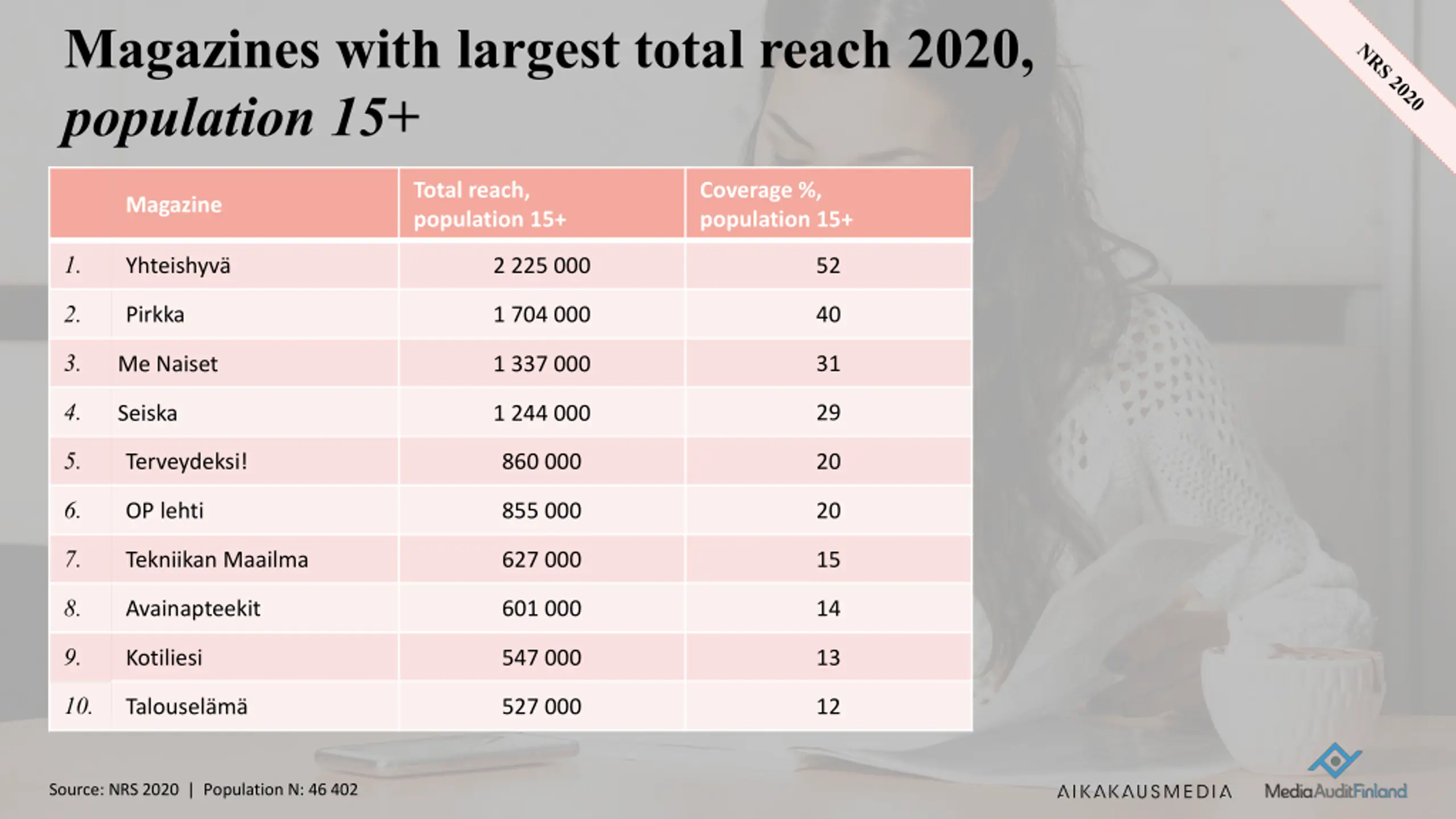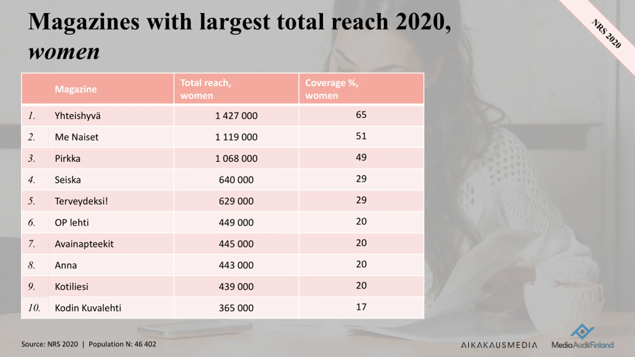 Magazines with largest total reach 2020, women Total reach, women Coverage %, women Magazine 1. 65 Yhteishyv 1 427 000 2. 51 Me Naiset 1 119 000 3. 49 Pirkka 1 068 000 4. 29 Seiska 640 000 5. 29 Terveydeksi! 629 000 6. 20 OP lehti 449 000 7. 20 Avainapteekit 445 000 8. 20 Anna 443 000 9. 20 Kotiliesi 439 000 10. 17 Kodin Kuvalehti 365 000 Source: NRS 2020 | Population N: 46 402