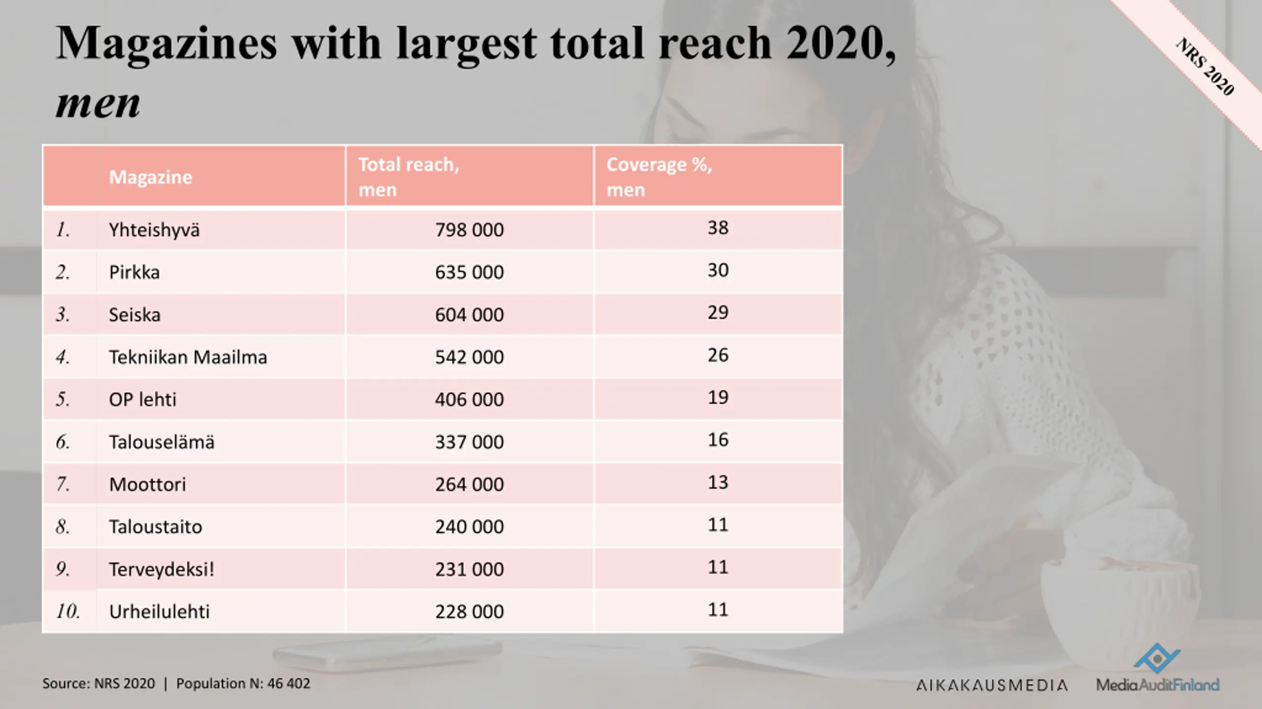 Magazines with largest total reach 2020, men Total reach, men Coverage %, men Magazine 1. 38 Yhteishyv 798 000 2. 30 Pirkka 635 000 3. 29 Seiska 604 000 4. 26 Tekniikan Maailma 542 000 5. 19 OP lehti 406 000 6. 16 Talousel m 337 000 7. 13 Moottori 264 000 8. 11 Taloustaito 240 000 9. 11 Terveydeksi! 231 000 10. 11 Urheilulehti 228 000 Source: NRS 2020 | Population N: 46 402