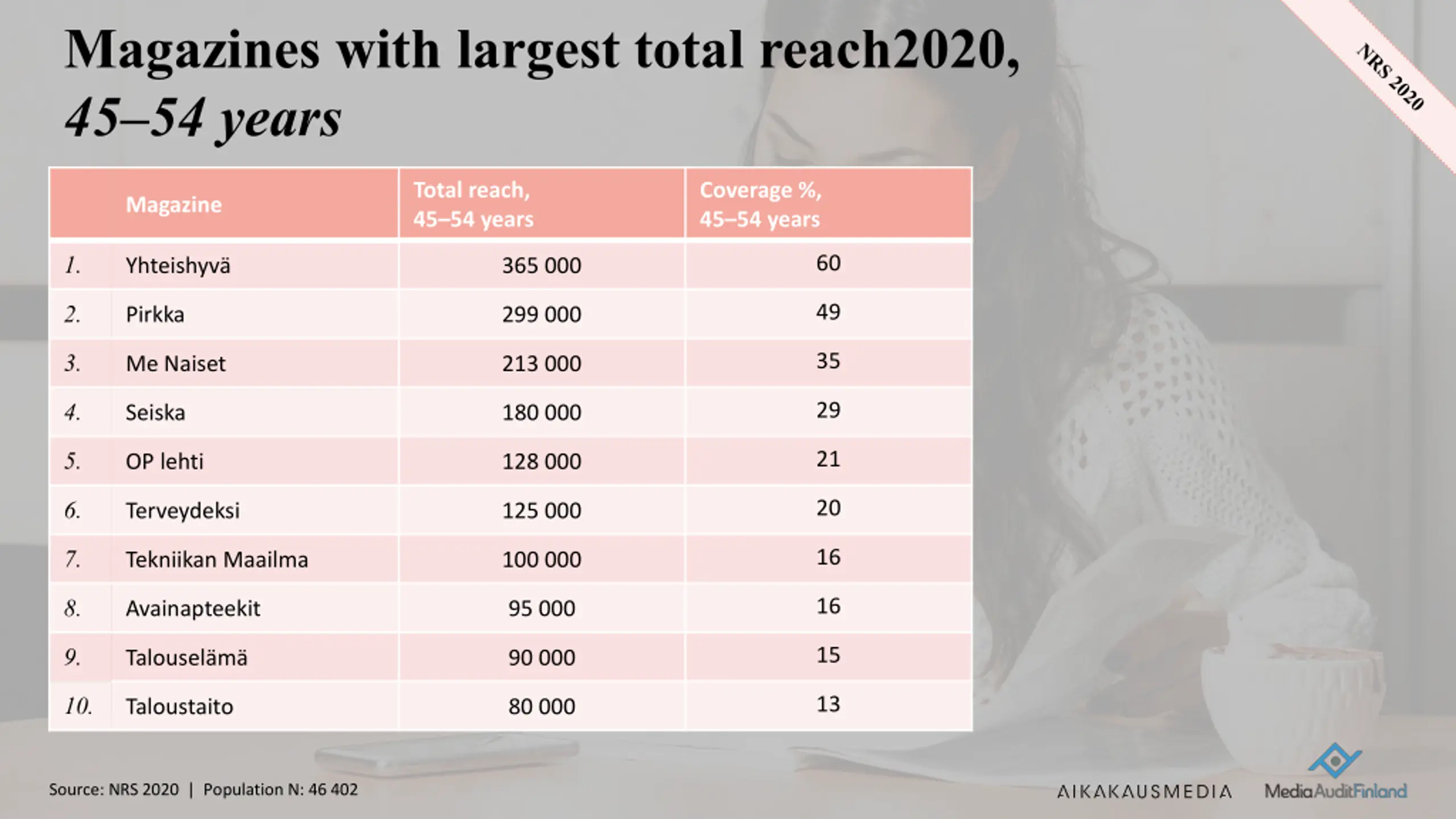 Magazines with largest total reach2020, 45 54 years Total reach, 45 54 years Coverage %, 45 54 years Magazine 1. 60 Yhteishyv 365 000 2. 49 Pirkka 299 000 3. 35 Me Naiset 213 000 4. 29 Seiska 180 000 5. 21 OP lehti 128 000 6. 20 Terveydeksi 125 000 7. 16 Tekniikan Maailma 100 000 8. 16 Avainapteekit 95 000 9. 15 Talousel m 90 000 10. 13 Taloustaito 80 000 Source: NRS 2020 | Population N: 46 402