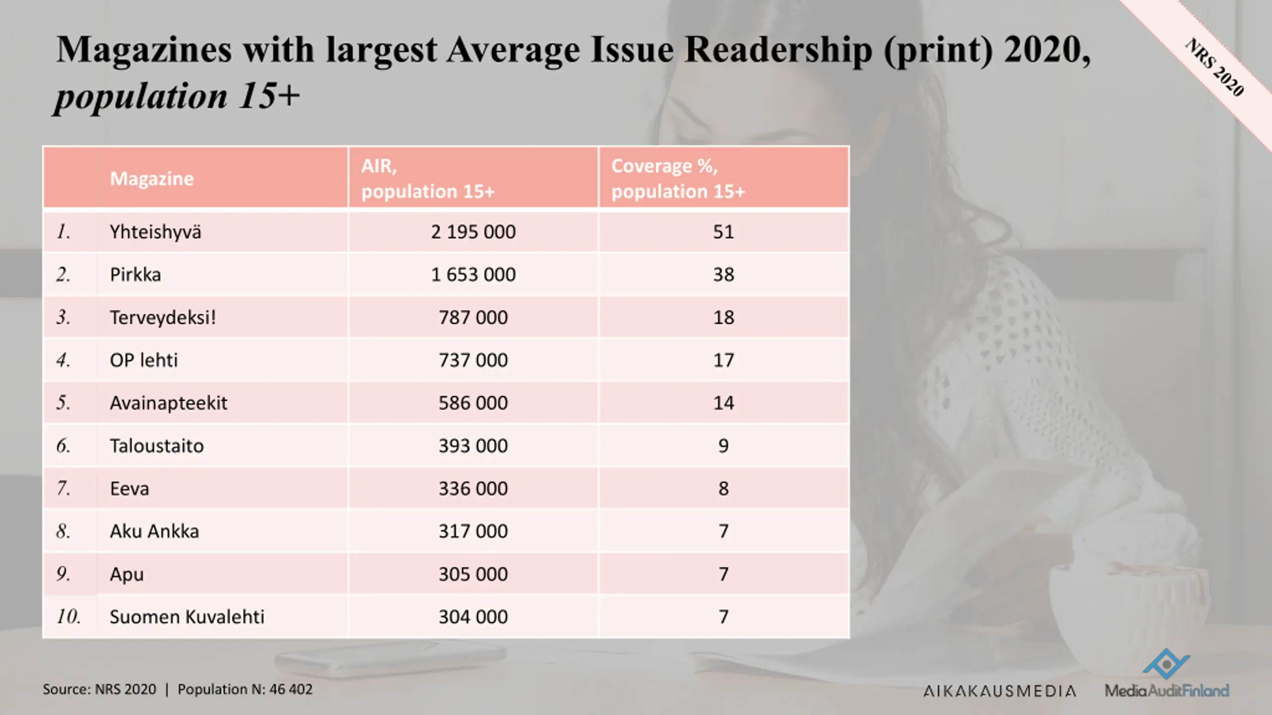 Magazines with largest Average Issue Readership (print) 2020, women AIR, women Coverage %, women Magazine 1. 64 Yhteishyv 1 408 000 2. 47 Pirkka 1 034 000 3. 26 Terveydeksi! 580 000 4. 20 Avainapteekit 436 000 5. 18 OP lehti 390 000 6. 13 Eeva 296 000 7. 11 Kodin Kuvalehti 238 000 8. 9 ET-lehti 206 000 9. 9 Hyv Terveys 199 000 10. 9 Suuri K sity 197 000 Source: NRS 2020 | Population N: 46 402