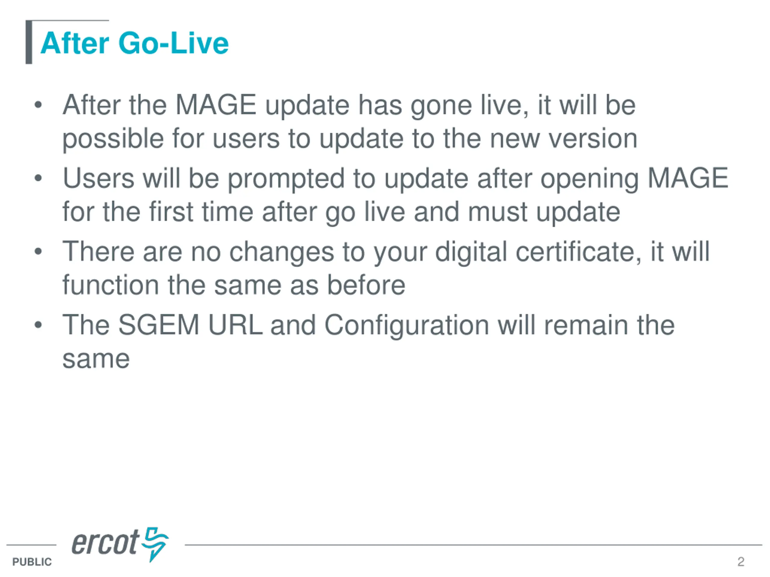 After Go-Live After the MAGE update has gone live, it will be possible for users to update to the new version Users will be prompted to update after opening MAGE for the first time after go live and must update There are no changes to your digital certificate, it will function the same as before The SGEM URL and Configuration will remain the same 2 PUBLIC