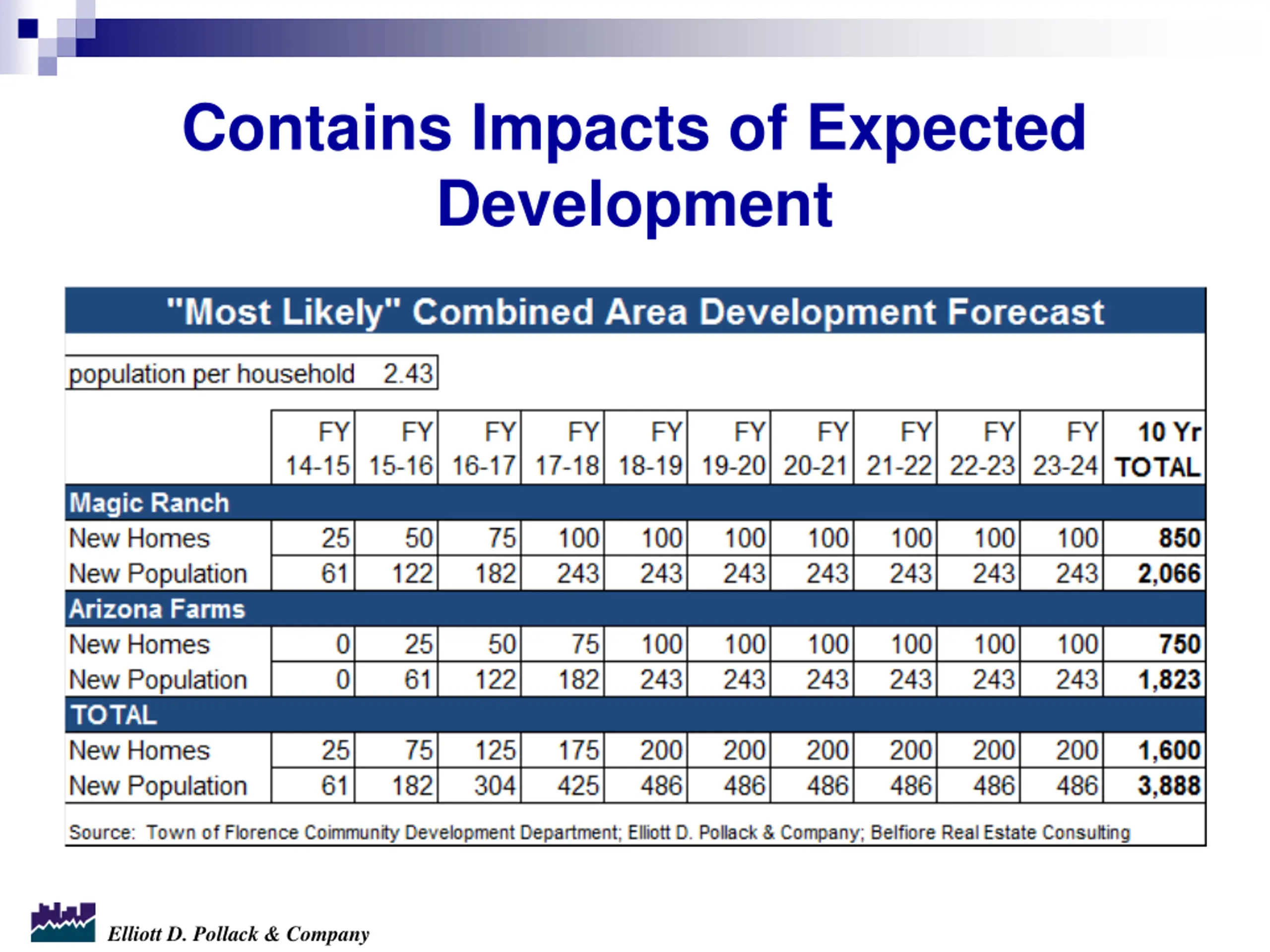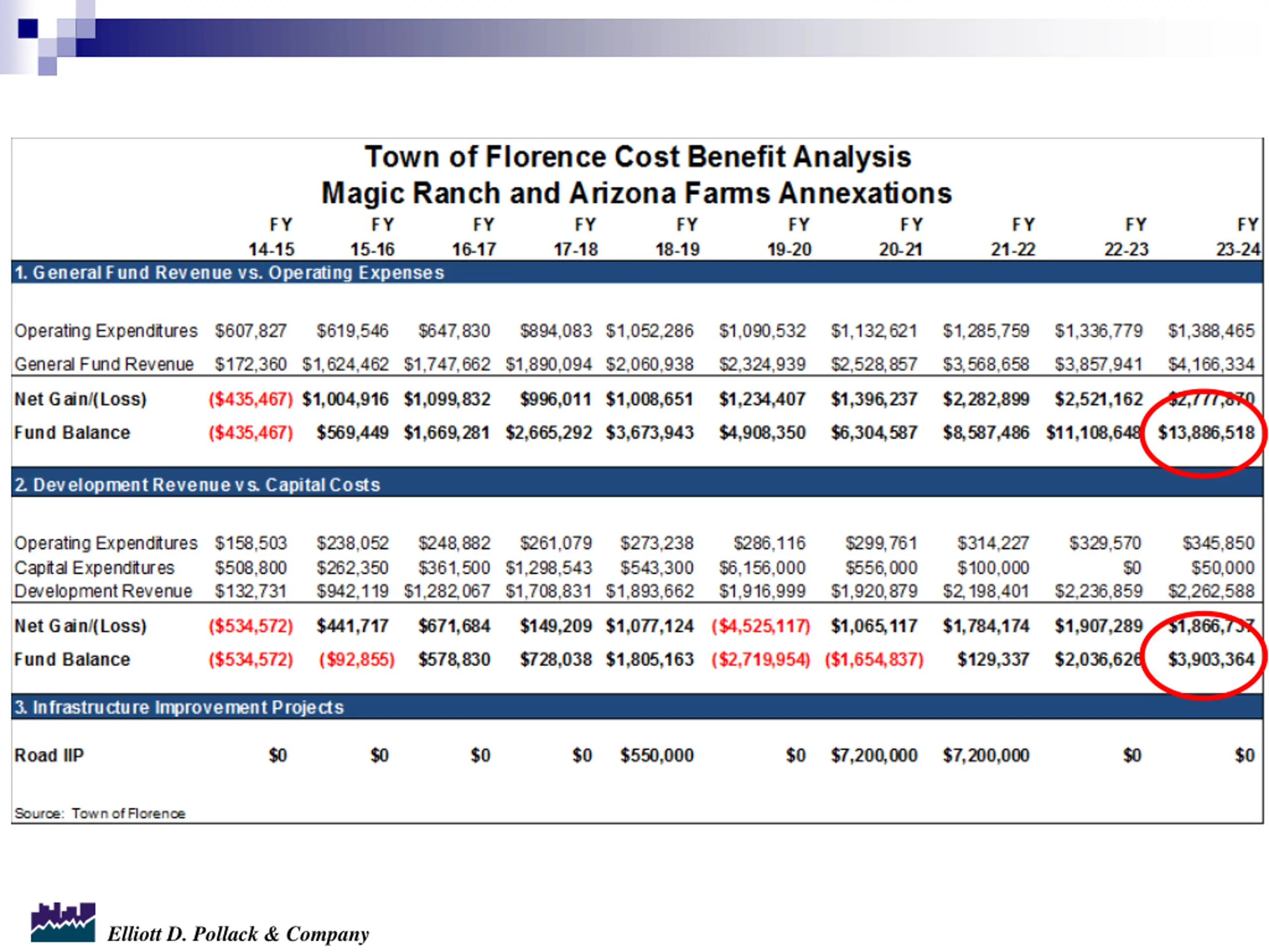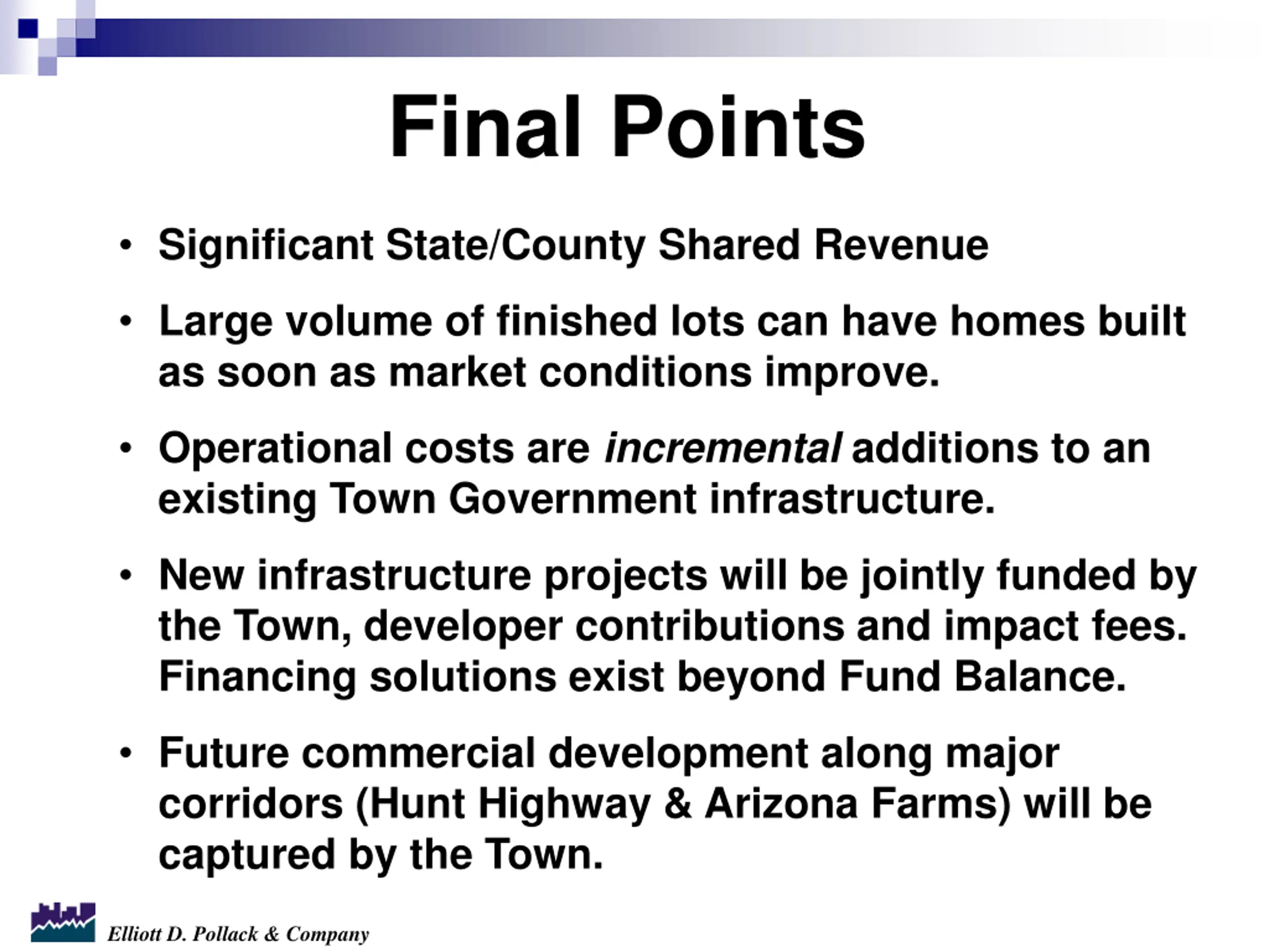 Final Points Significant State/County Shared Revenue Large volume of finished lots can have homes built as soon as market conditions improve. Operational costs are incremental additions to an existing Town Government infrastructure. New infrastructure projects will be jointly funded by the Town, developer contributions and impact fees. Financing solutions exist beyond Fund Balance. Future commercial development along major corridors (Hunt Highway & Arizona Farms) will be captured by the Town. Elliott D. Pollack & Company