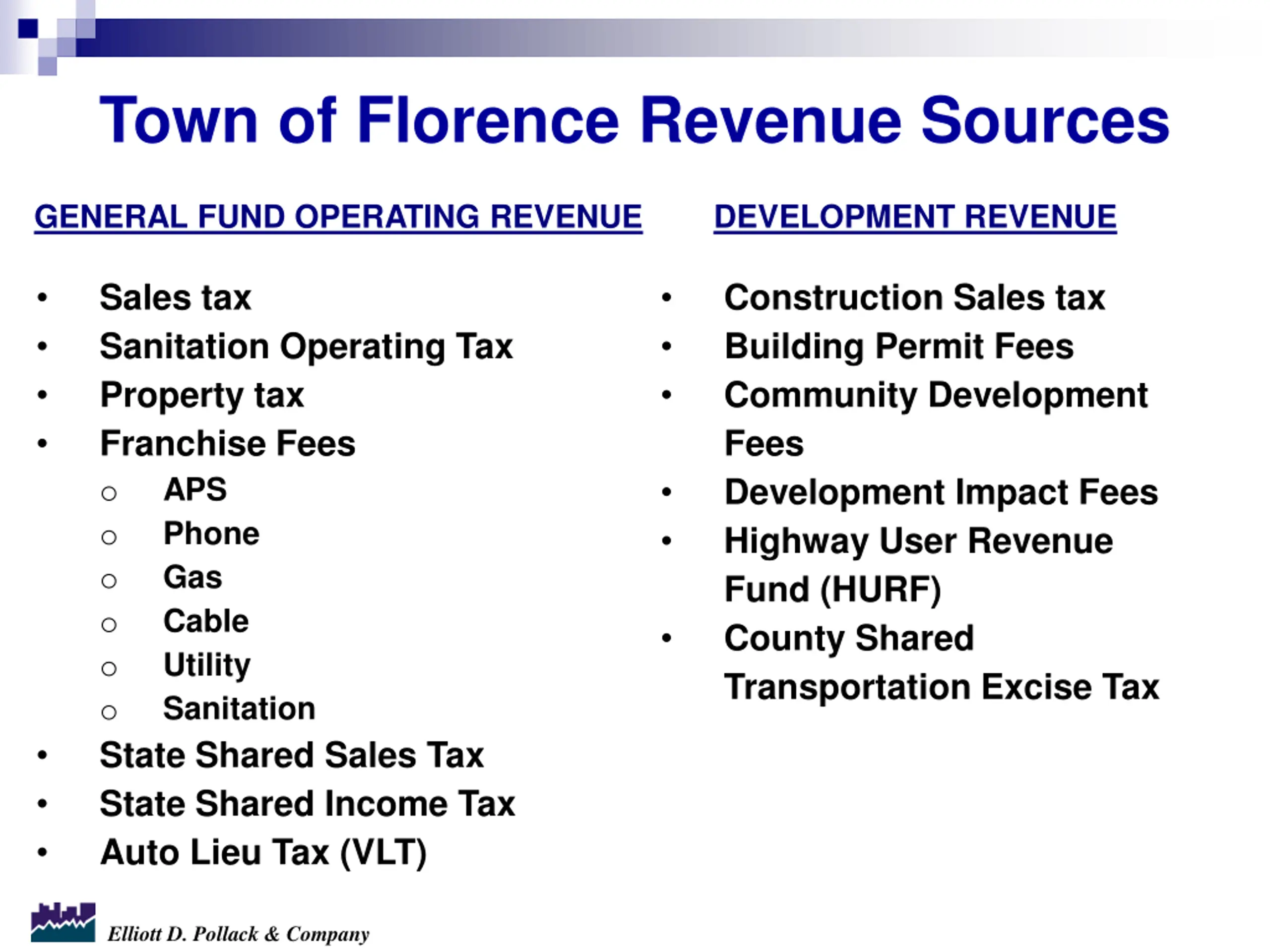 Town of Florence Revenue Sources GENERAL FUND OPERATING REVENUE DEVELOPMENT REVENUE Sales tax Sanitation Operating Tax Property tax Franchise Fees o APS o Phone o Gas o Cable o Utility o Sanitation State Shared Sales Tax State Shared Income Tax Auto Lieu Tax (VLT) Construction Sales tax Building Permit Fees Community Development Fees Development Impact Fees Highway User Revenue Fund (HURF) County Shared Transportation Excise Tax Elliott D. Pollack & Company