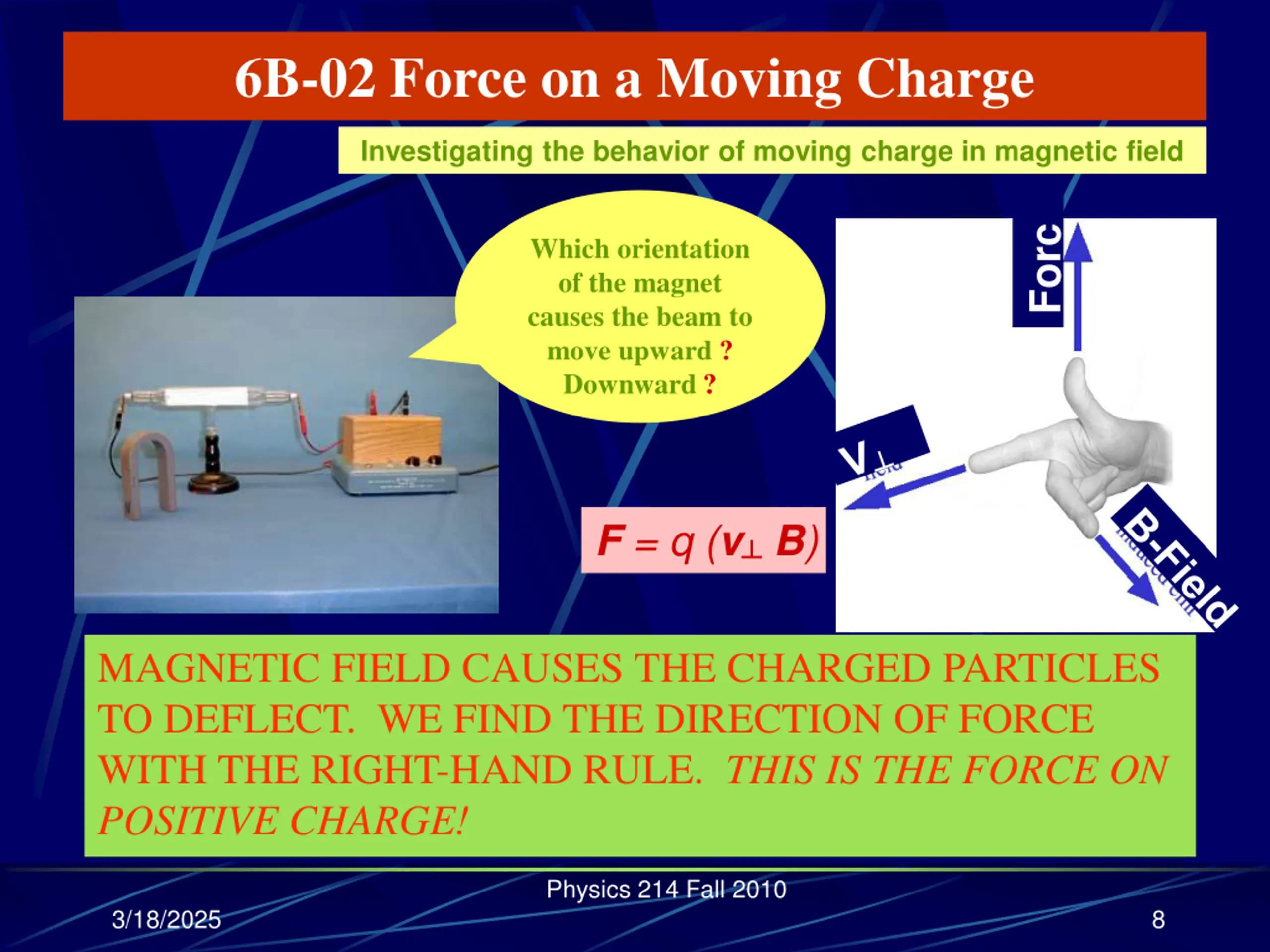 6B-02 Force on a Moving Charge Investigating the behavior of moving charge in magnetic field Forc Which orientation of the magnet causes the beam to move upward ? Downward ? e F = q (v B) MAGNETIC FIELD CAUSES THE CHARGED PARTICLES TO DEFLECT. WE FIND THE DIRECTION OF FORCE WITH THE RIGHT-HAND RULE. THIS IS THE FORCE ON POSITIVE CHARGE! Physics 214 Fall 2010 3/18/2025 8