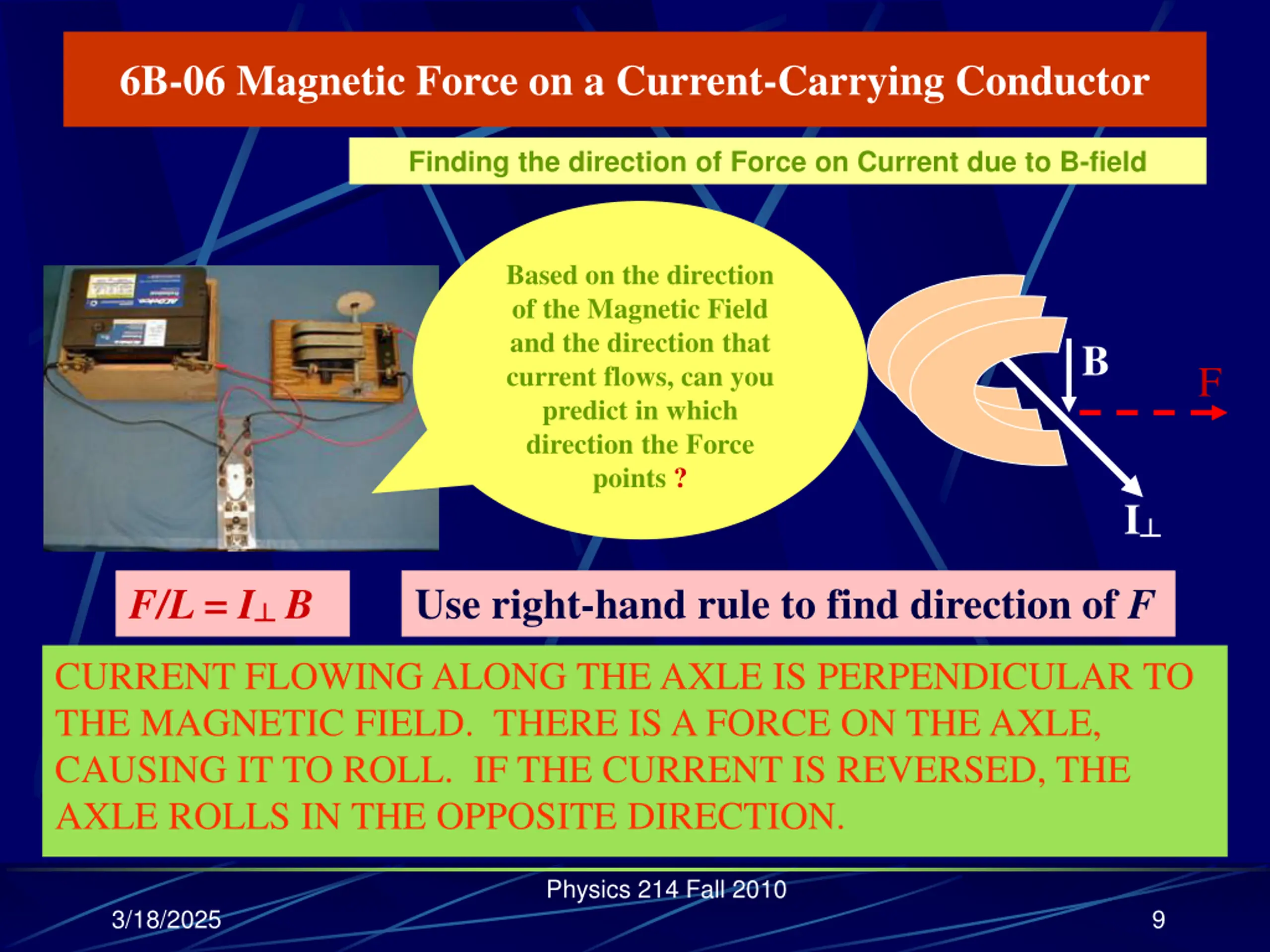 6B-06 Magnetic Force on a Current-Carrying Conductor Finding the direction of Force on Current due to B-field Based on the direction of the Magnetic Field and the direction that current flows, can you predict in which direction the Force points ? B F I F/L = I B Use right-hand rule to find direction of F CURRENT FLOWING ALONG THE AXLE IS PERPENDICULAR TO THE MAGNETIC FIELD. THERE IS A FORCE ON THE AXLE, CAUSING IT TO ROLL. IF THE CURRENT IS REVERSED, THE AXLE ROLLS IN THE OPPOSITE DIRECTION. Physics 214 Fall 2010 3/18/2025 9