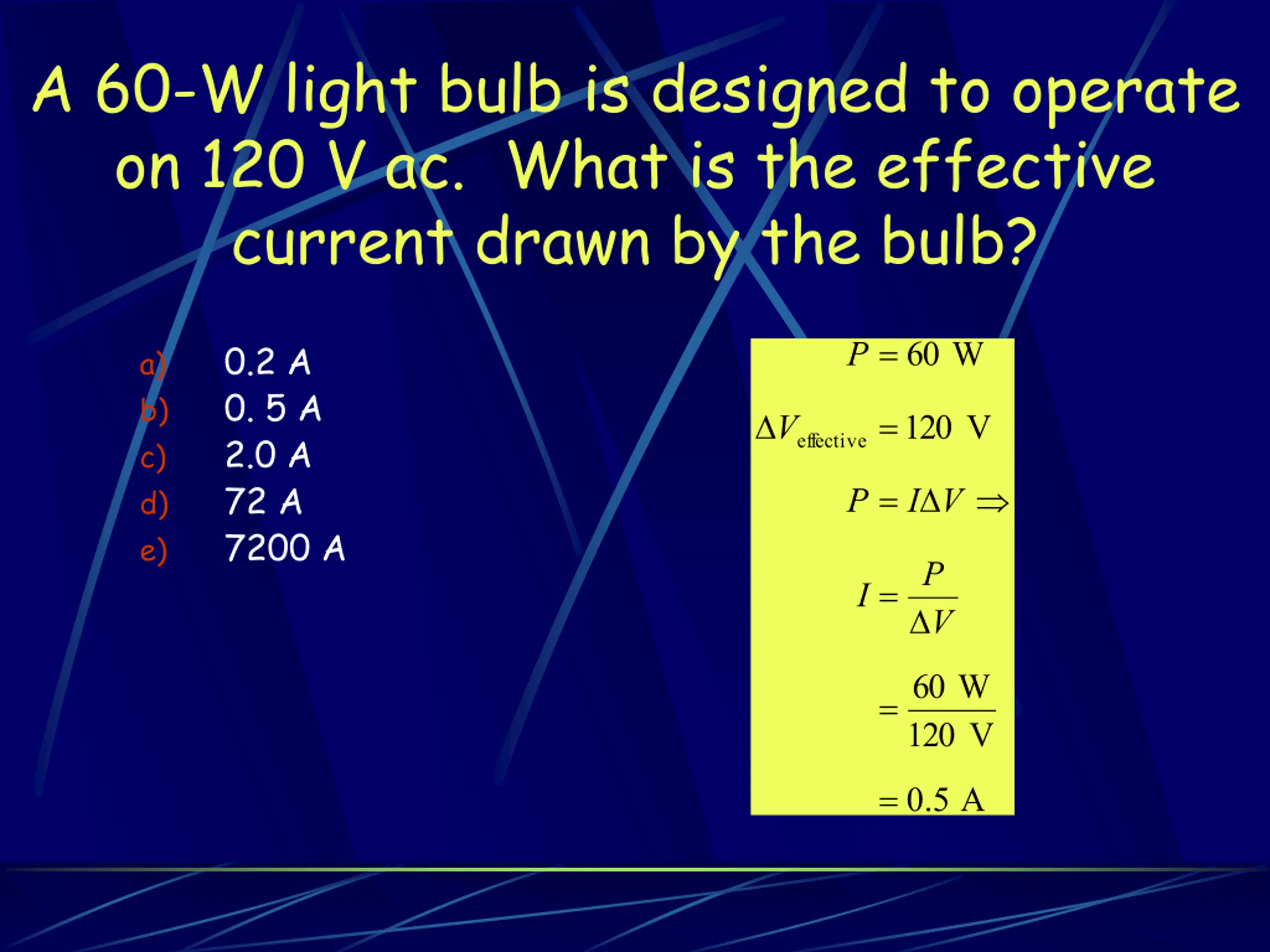 A 60-W light bulb is designed to operate on 120 V ac. What is the effective current drawn by the bulb? P = 60 W 0.2 A 0. 5 A 2.0 A 72 A 7200 A a) b) c) d) e) Veffective=120 V P = I V P I = V =60 W 120 V = 0.5 A