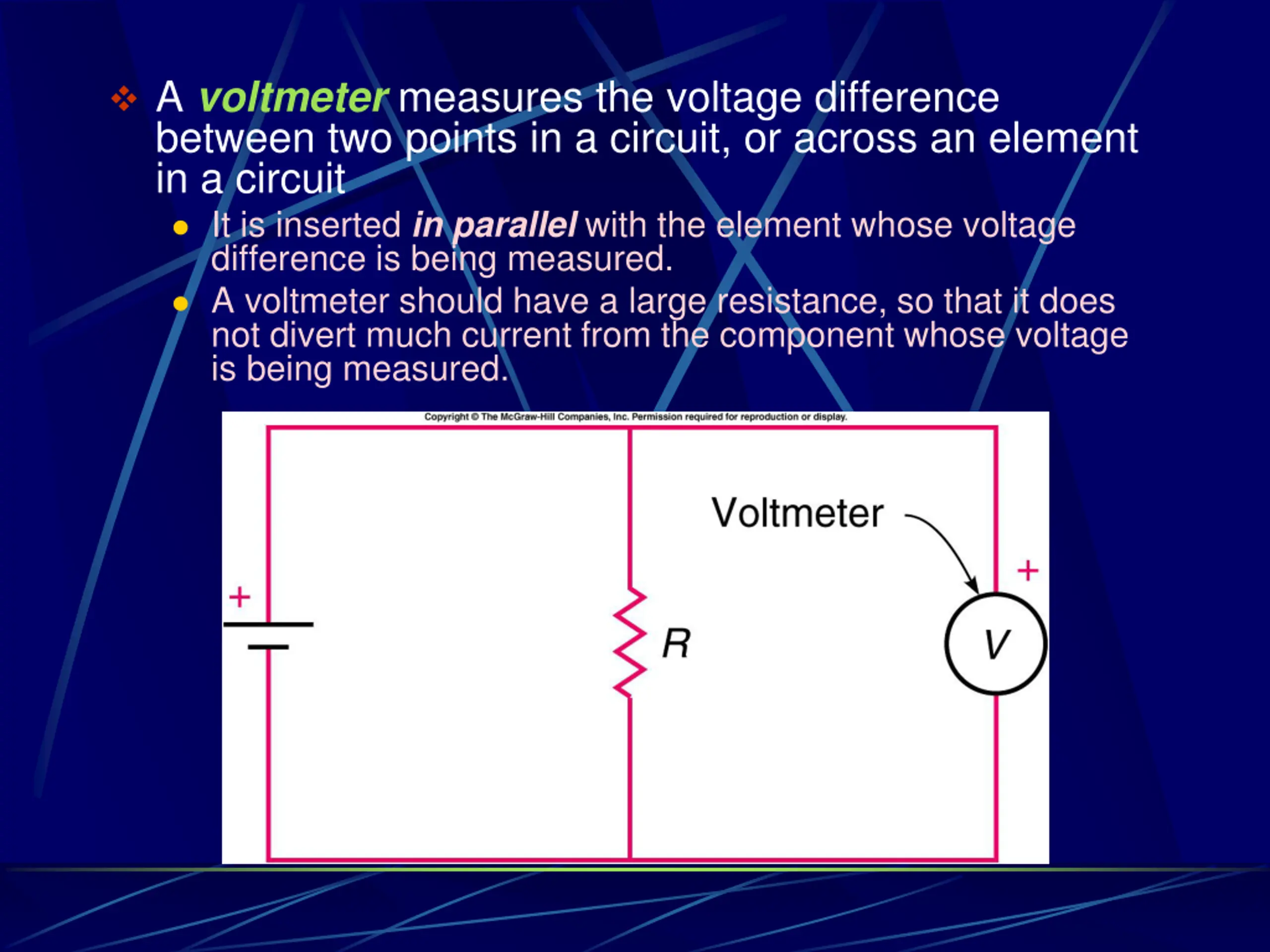 A voltmeter measures the voltage difference between two points in a circuit, or across an element in a circuit It is inserted in parallel with the element whose voltage difference is being measured. A voltmeter should have a large resistance, so that it does not divert much current from the component whose voltage is being measured.