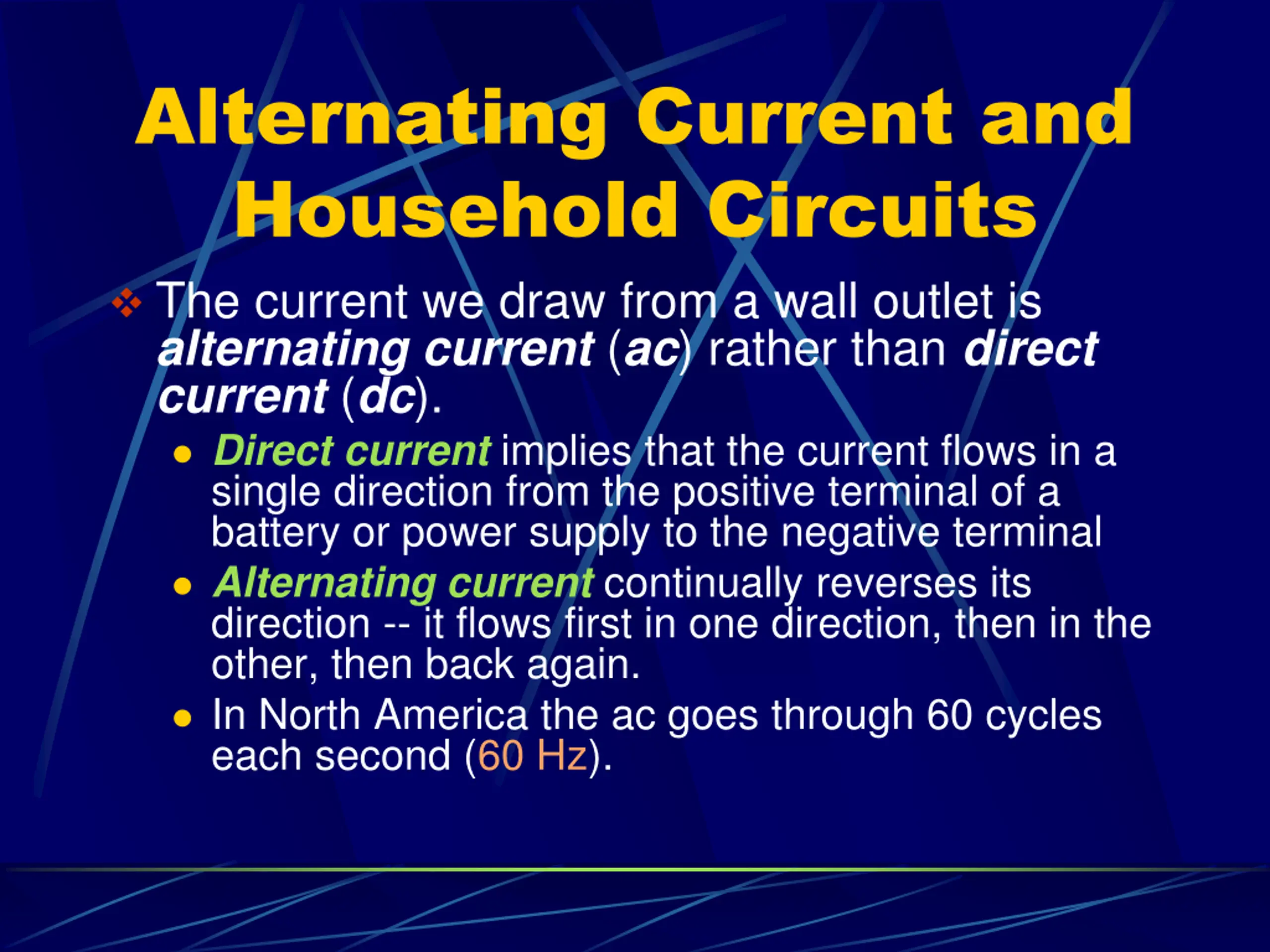 Alternating Current and Household Circuits The current we draw from a wall outlet is alternating current (ac) rather than direct current (dc). Direct current implies that the current flows in a single direction from the positive terminal of a battery or power supply to the negative terminal Alternating current continually reverses its direction -- it flows first in one direction, then in the other, then back again. In North America the ac goes through 60 cycles each second (60 Hz).