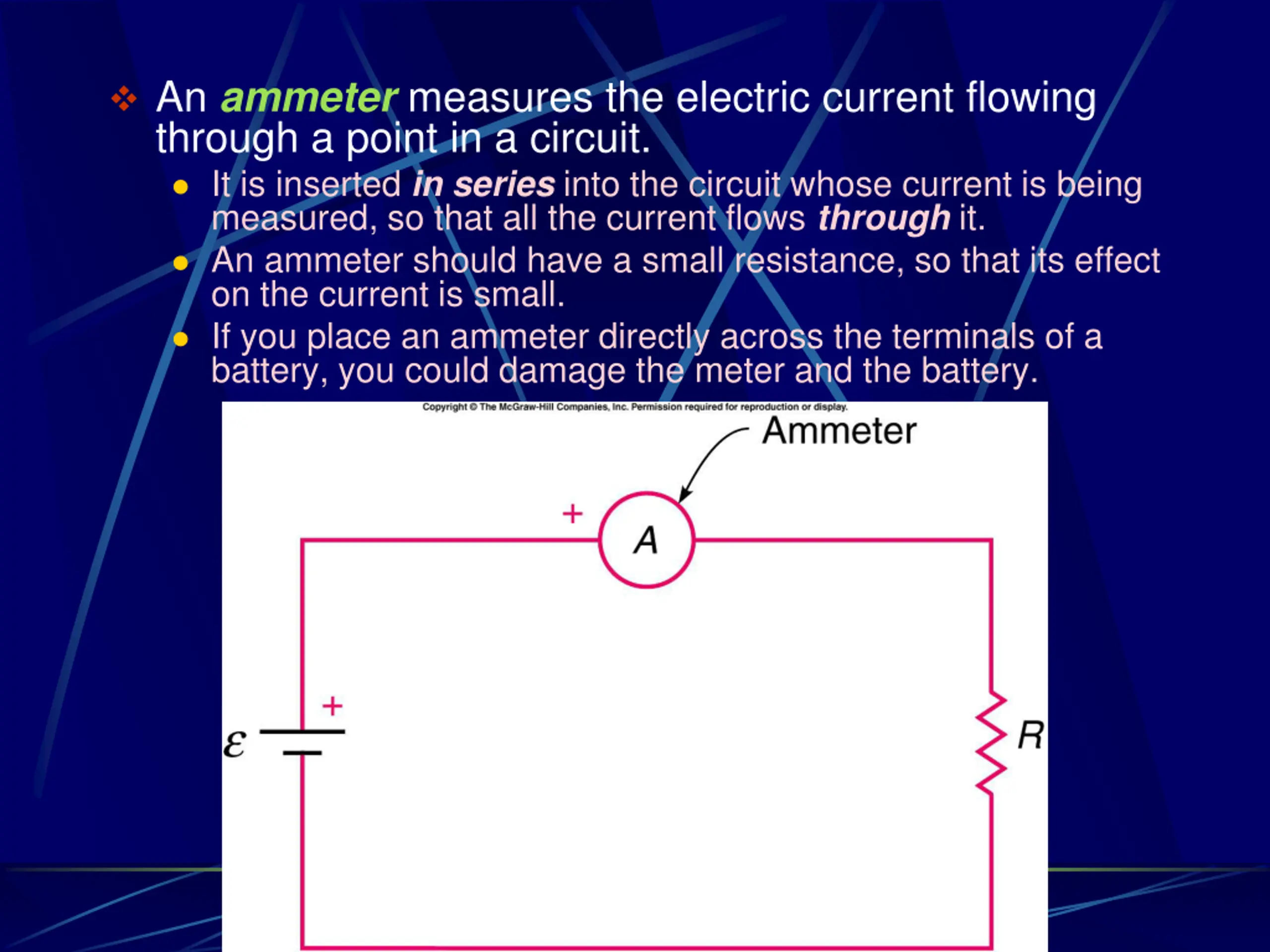 An ammeter measures the electric current flowing through a point in a circuit. It is inserted in series into the circuit whose current is being measured, so that all the current flows through it. An ammeter should have a small resistance, so that its effect on the current is small. If you place an ammeter directly across the terminals of a battery, you could damage the meter and the battery.