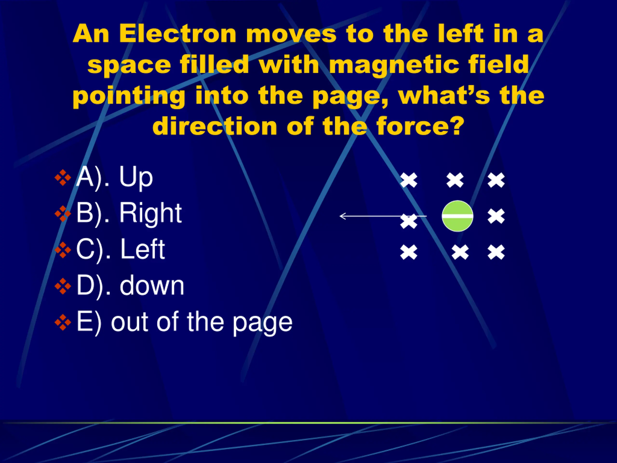An Electron moves to the left in a space filled with magnetic field pointing into the page, what s the direction of the force? A). Up B). Right C). Left D). down E) out of the page