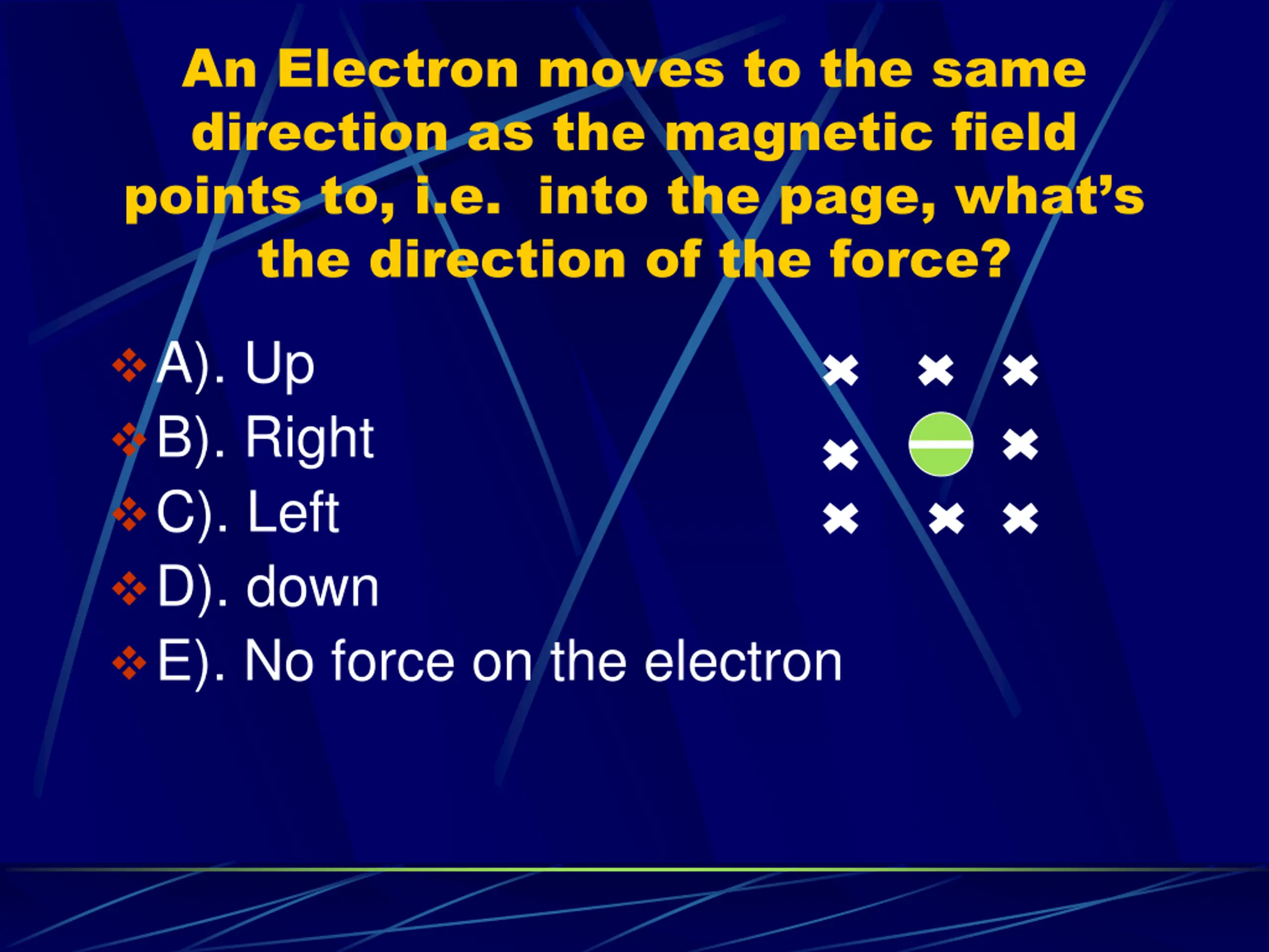 An Electron moves to the same direction as the magnetic field points to, i.e. into the page, what s the direction of the force? A). Up B). Right C). Left D). down E). No force on the electron
