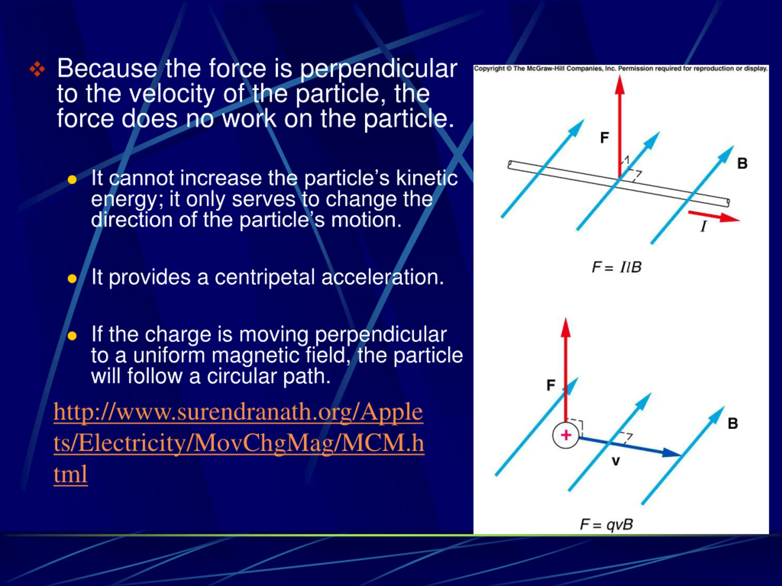 Because the force is perpendicular to the velocity of the particle, the force does no work on the particle. It cannot increase the particle s kinetic energy; it only serves to change the direction of the particle s motion. It provides a centripetal acceleration. If the charge is moving perpendicular to a uniform magnetic field, the particle will follow a circular path. http://www.surendranath.org/Apple ts/Electricity/MovChgMag/MCM.h tml