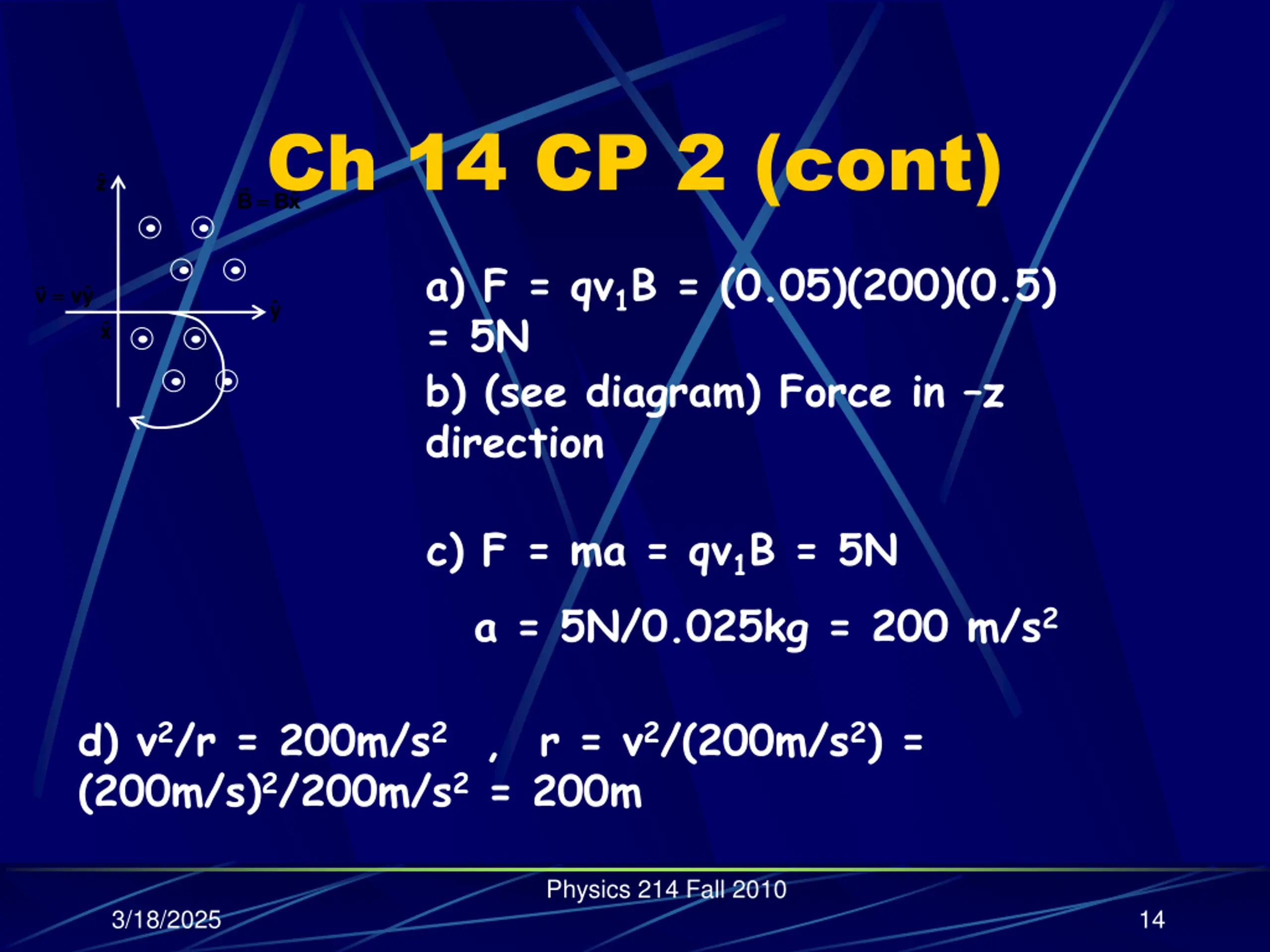 Ch 14 CP 2 (cont) Bx = = .... .... z B a) F = qv1B = (0.05)(200)(0.5) = 5N b) (see diagram) Force in z direction = = v vy y x c) F = ma = qv1B = 5N a = 5N/0.025kg = 200 m/s2 d) v2/r = 200m/s2 , r = v2/(200m/s2) = (200m/s)2/200m/s2 = 200m Physics 214 Fall 2010 3/18/2025 14