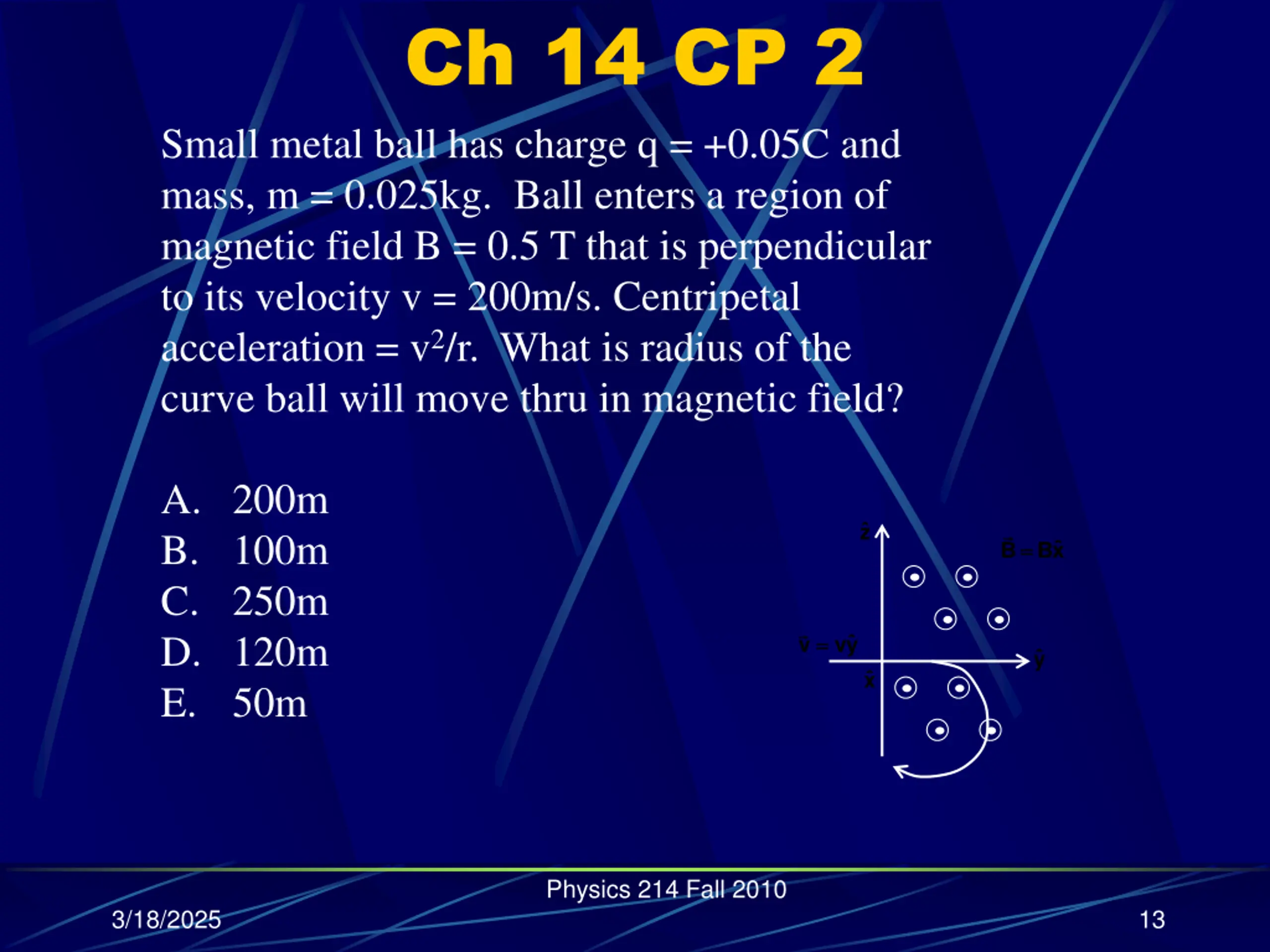 Ch 14 CP 2 Small metal ball has charge q = +0.05C and mass, m = 0.025kg. Ball enters a region of magnetic field B = 0.5 T that is perpendicular to its velocity v = 200m/s. Centripetal acceleration = v2/r. What is radius of the curve ball will move thru in magnetic field? A. 200m B. 100m C. 250m D. 120m E. 50m .... .... z = = B Bx = = v vy y x Physics 214 Fall 2010 3/18/2025 13