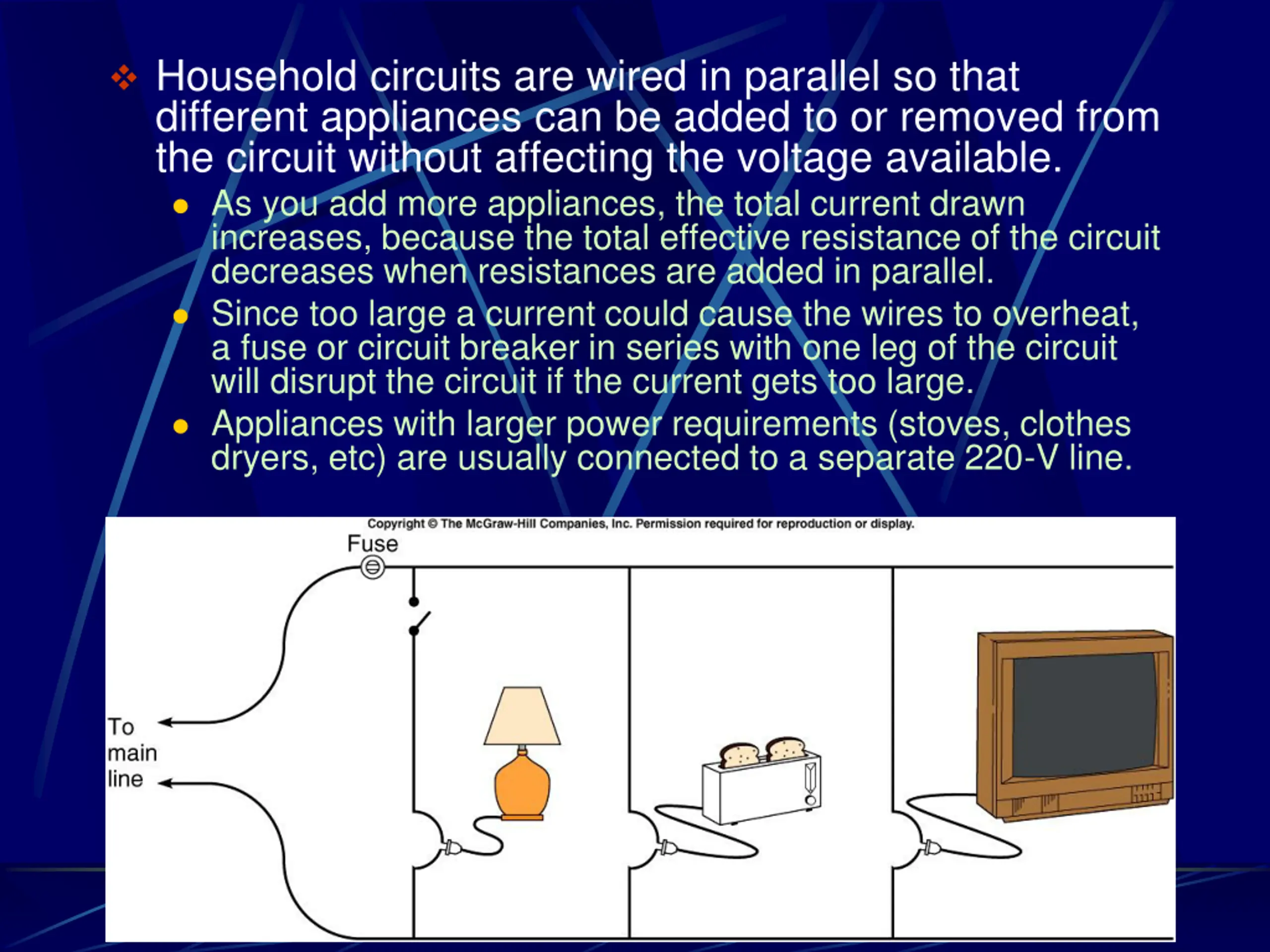 Household circuits are wired in parallel so that different appliances can be added to or removed from the circuit without affecting the voltage available. As you add more appliances, the total current drawn increases, because the total effective resistance of the circuit decreases when resistances are added in parallel. Since too large a current could cause the wires to overheat, a fuse or circuit breaker in series with one leg of the circuit will disrupt the circuit if the current gets too large. Appliances with larger power requirements (stoves, clothes dryers, etc) are usually connected to a separate 220-V line.