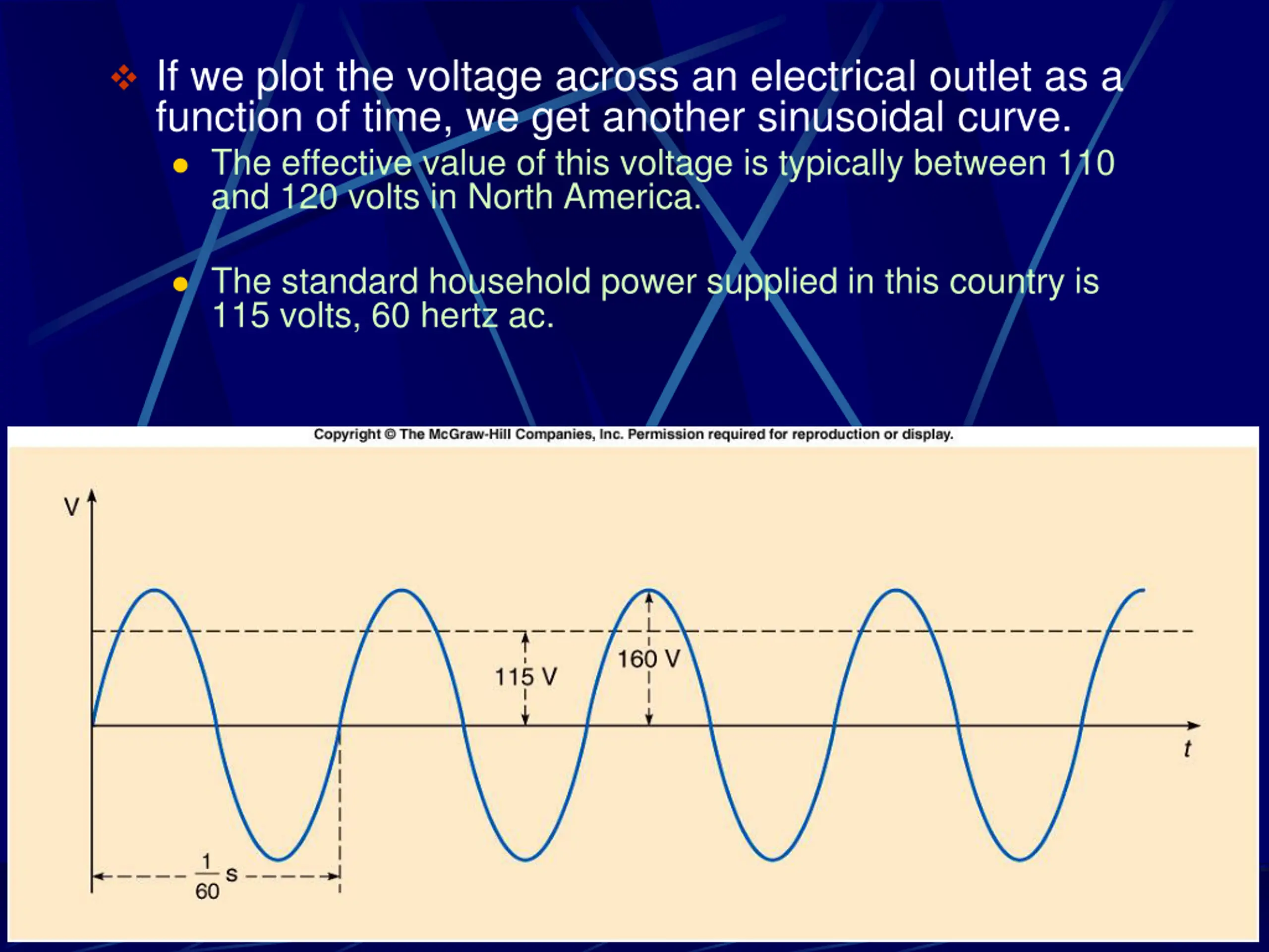 If we plot the voltage across an electrical outlet as a function of time, we get another sinusoidal curve. The effective value of this voltage is typically between 110 and 120 volts in North America. The standard household power supplied in this country is 115 volts, 60 hertz ac.