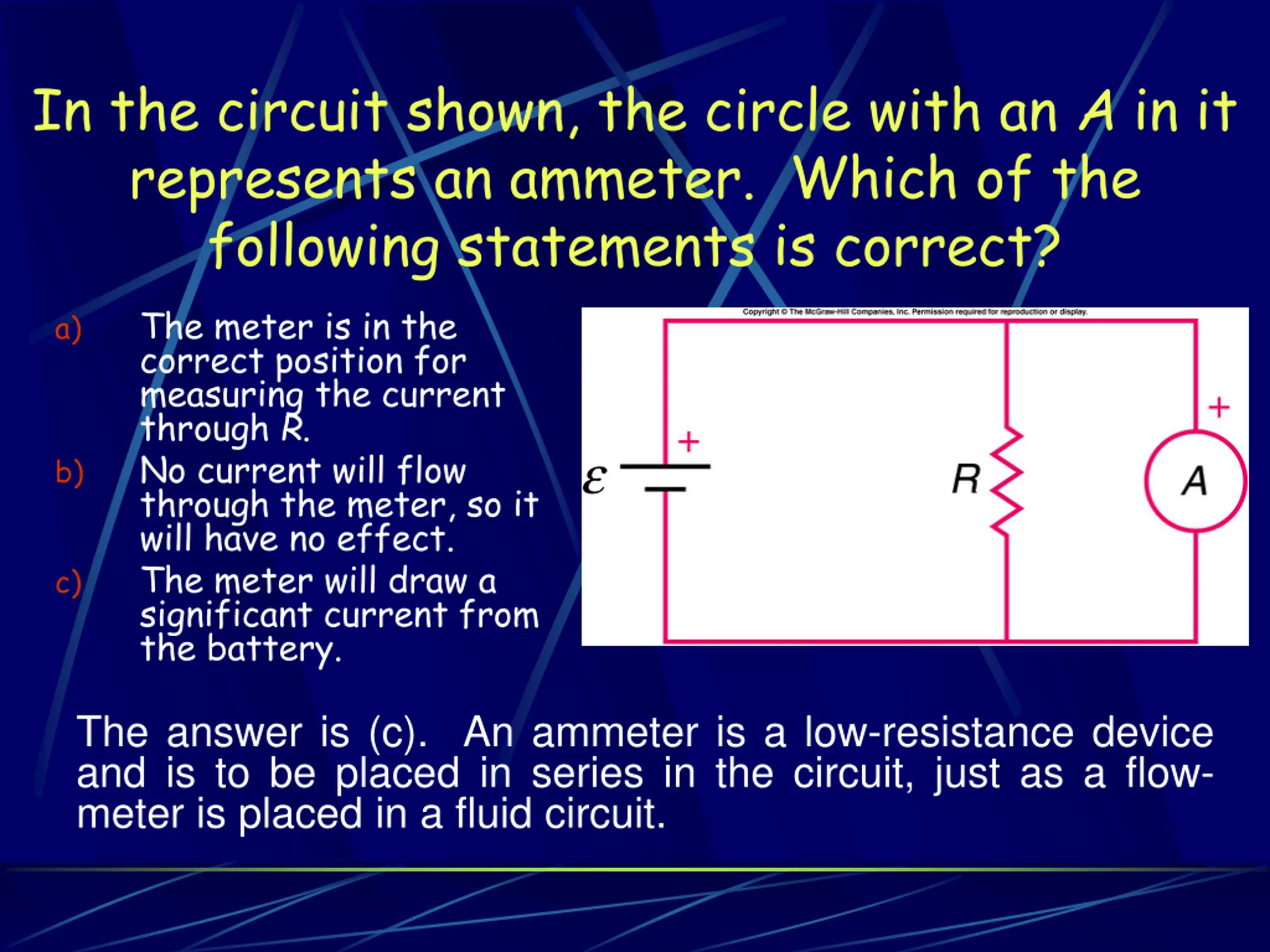 In the circuit shown, the circle with an A in it represents an ammeter. Which of the following statements is correct? The meter is in the correct position for measuring the current through R. No current will flow through the meter, so it will have no effect. The meter will draw a significant current from the battery. a) b) c) The answer is (c). An ammeter is a low-resistance device and is to be placed in series in the circuit, just as a flow- meter is placed in a fluid circuit.