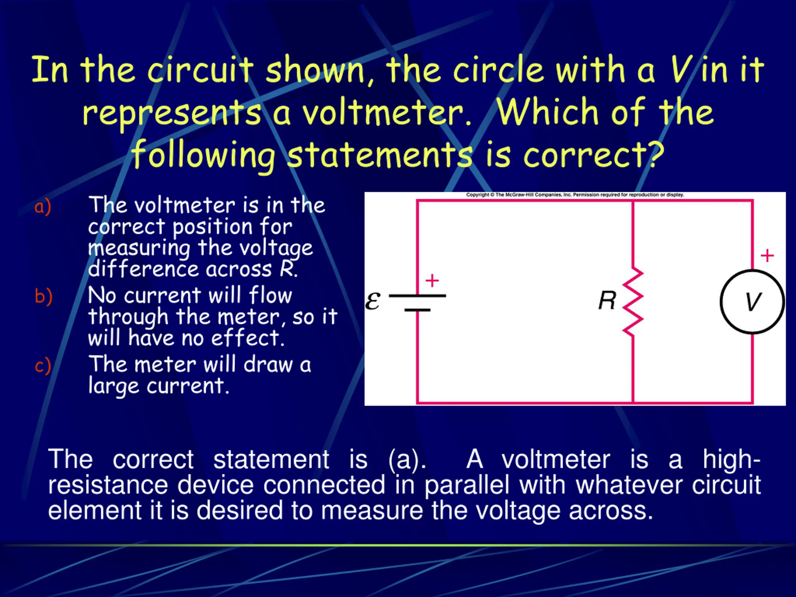In the circuit shown, the circle with a V in it represents a voltmeter. Which of the following statements is correct? The voltmeter is in the correct position for measuring the voltage difference across R. No current will flow through the meter, so it will have no effect. The meter will draw a large current. a) b) c) The correct statement is (a). A voltmeter is a high- resistance device connected in parallel with whatever circuit element it is desired to measure the voltage across.