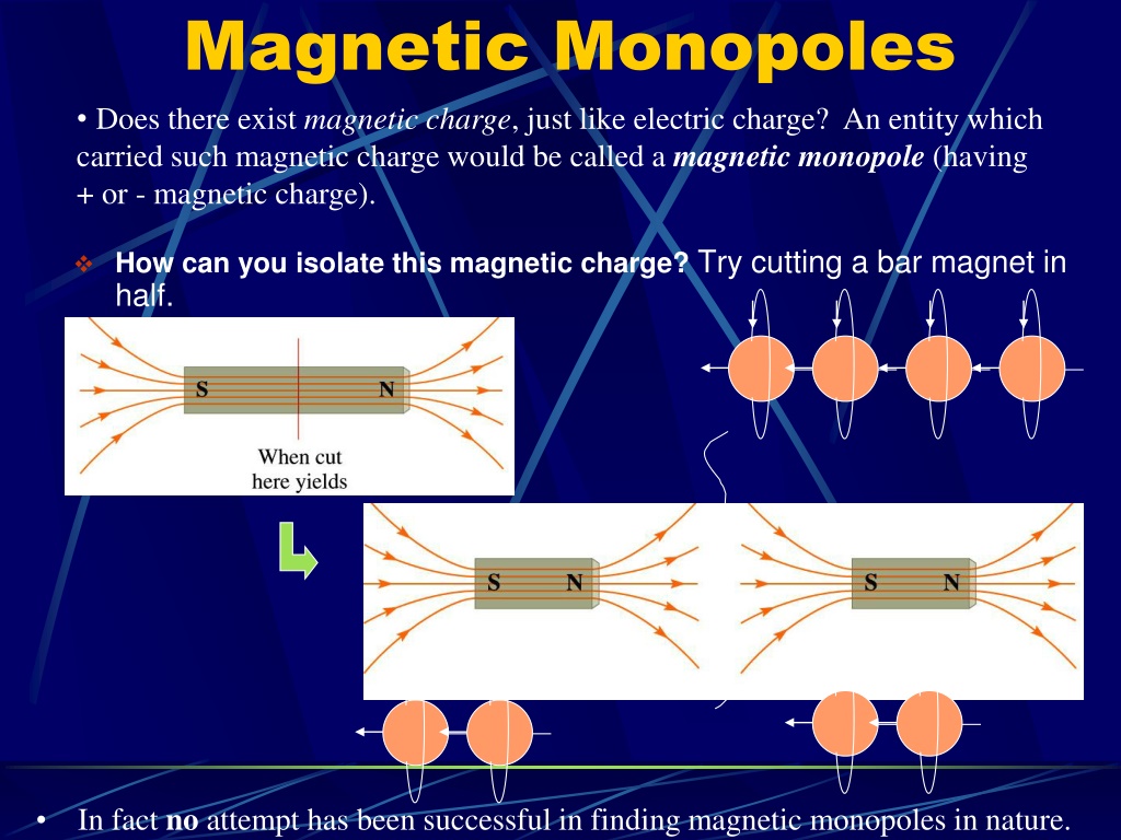 Magnetic Monopoles Does there exist magnetic charge, just like electric charge? An entity which carried such magnetic charge would be called a magnetic monopole (having + or - magnetic charge). How can you isolate this magnetic charge? Try cutting a bar magnet in half. In fact no attempt has been successful in finding magnetic monopoles in nature.
