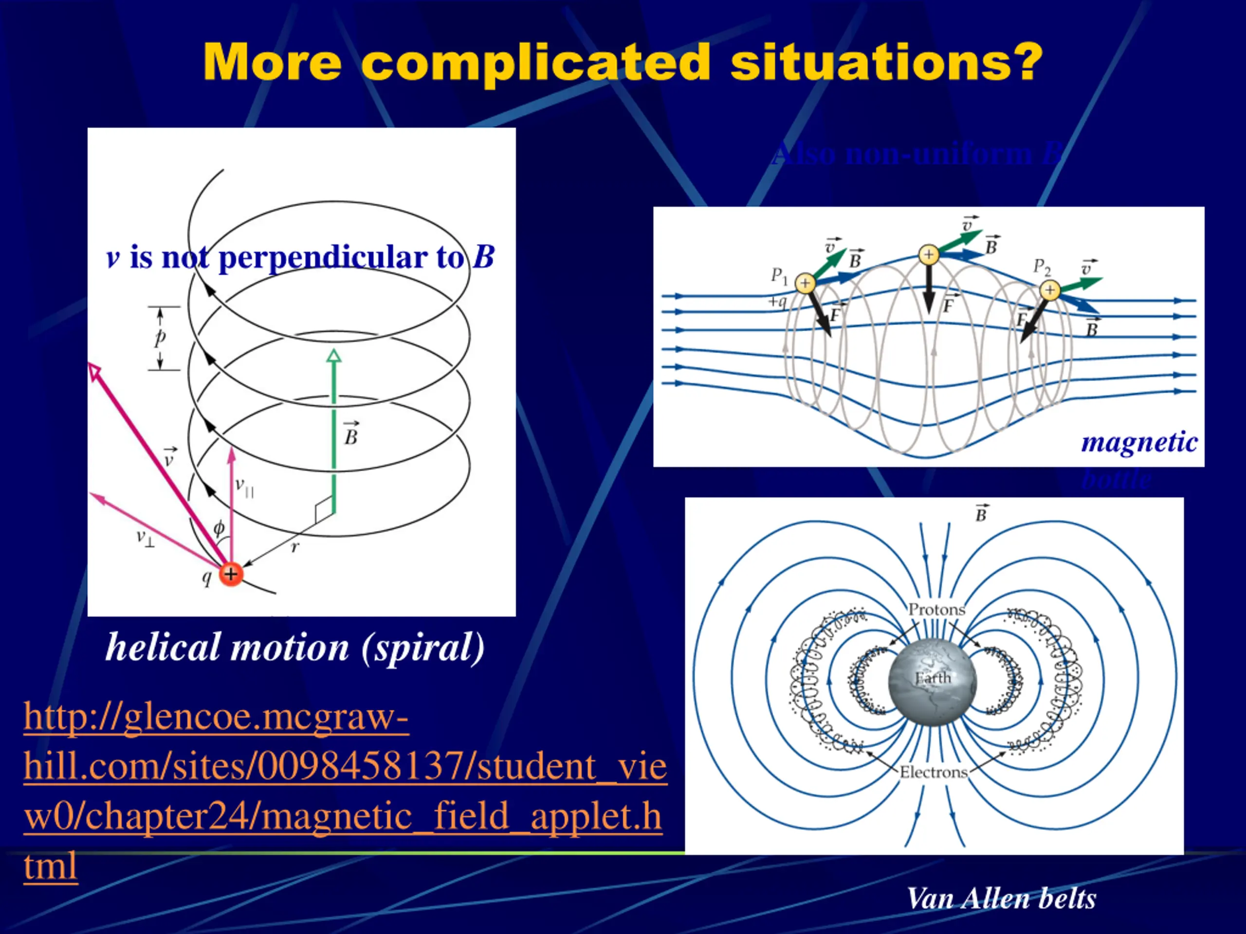 More complicated situations? Also non-uniform B v is not perpendicular to B magnetic bottle helical motion (spiral) http://glencoe.mcgraw- hill.com/sites/0098458137/student_vie w0/chapter24/magnetic_field_applet.h tml Van Allen belts