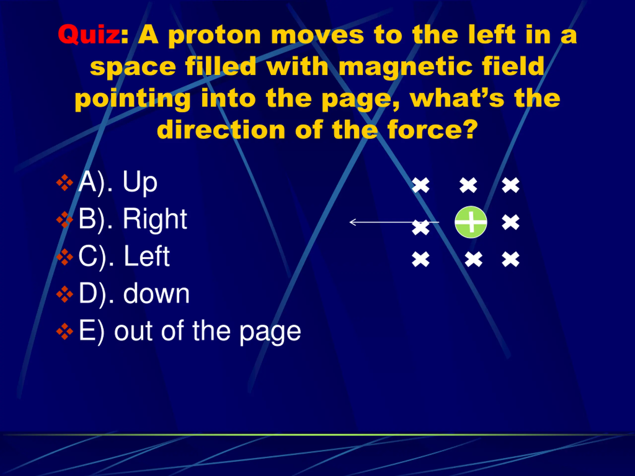 Quiz: A proton moves to the left in a space filled with magnetic field pointing into the page, what s the direction of the force? A). Up B). Right C). Left D). down E) out of the page