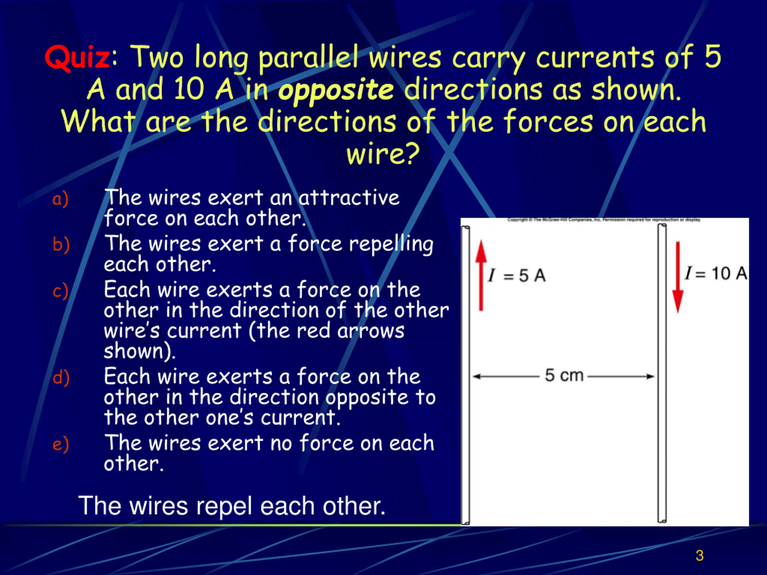 Quiz: Two long parallel wires carry currents of 5 A and 10 A in opposite directions as shown. What are the directions of the forces on each wire? The wires exert an attractive force on each other. b) The wires exert a force repelling each other. c) Each wire exerts a force on the other in the direction of the other wire s current (the red arrows shown). d) Each wire exerts a force on the other in the direction opposite to the other one s current. e) The wires exert no force on each other. a) The wires repel each other. 3