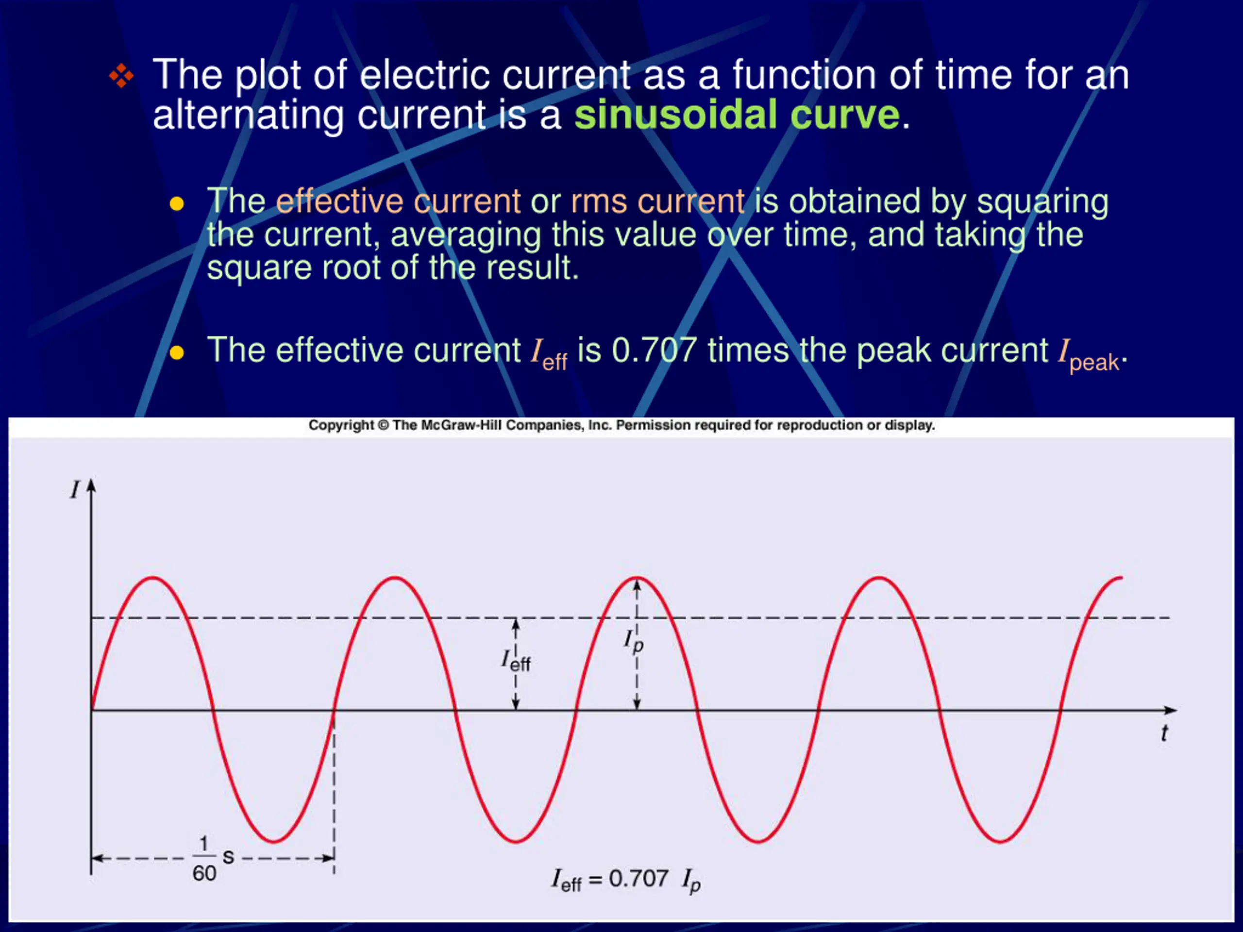 The plot of electric current as a function of time for an alternating current is a sinusoidal curve. The effective current or rms current is obtained by squaring the current, averaging this value over time, and taking the square root of the result. The effective current Ieff is 0.707 times the peak current Ipeak.