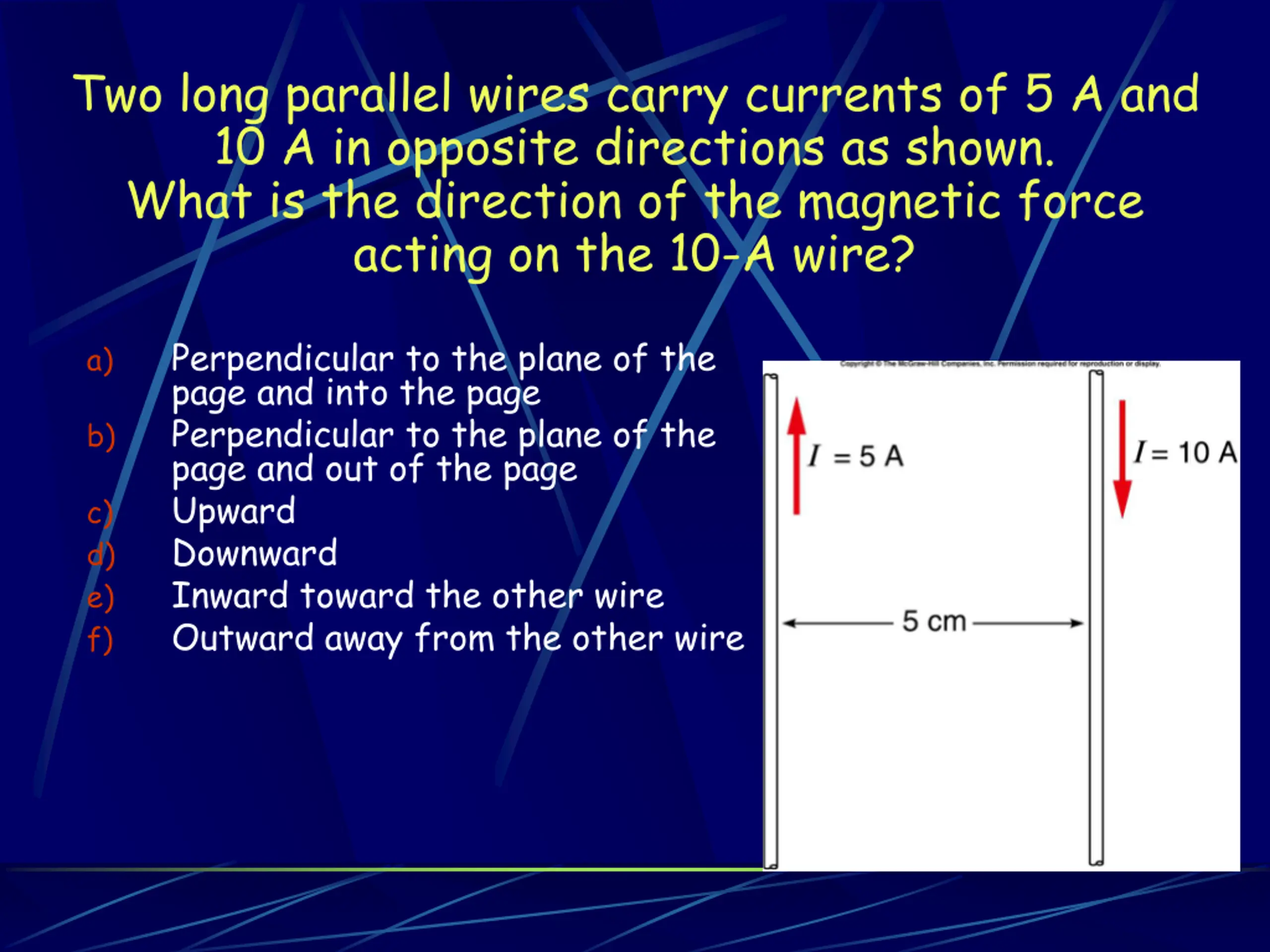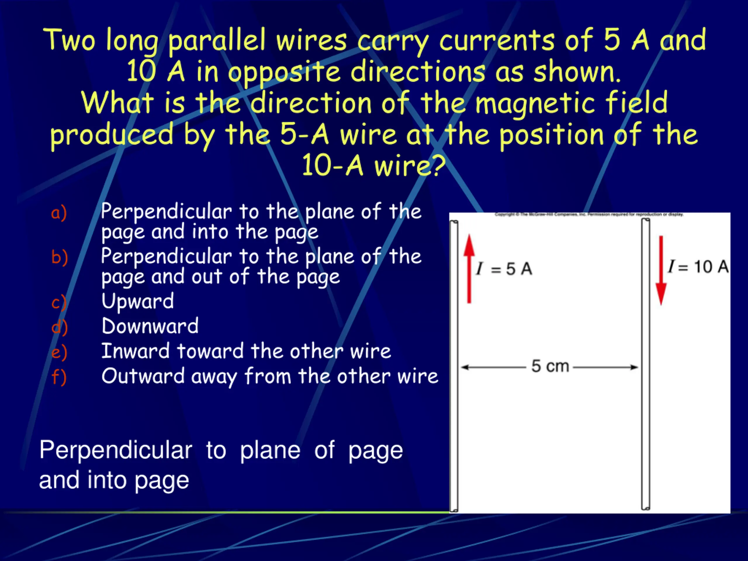 Two long parallel wires carry currents of 5 A and 10 A in opposite directions as shown. What is the direction of the magnetic field produced by the 5-A wire at the position of the 10-A wire? Perpendicular to the plane of the page and into the page Perpendicular to the plane of the page and out of the page Upward Downward Inward toward the other wire Outward away from the other wire a) b) c) d) e) f) Perpendicular to plane of page and into page