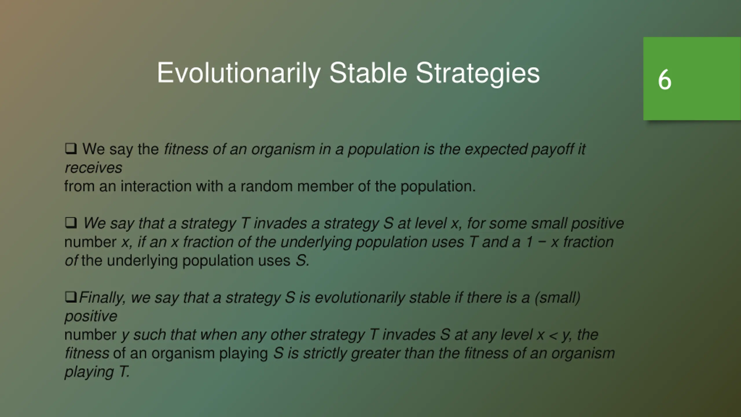 Evolutionarily Stable Strategies 6 We say the fitness of an organism in a population is the expected payoff it receives from an interaction with a random member of the population. We say that a strategy T invades a strategy S at level x, for some small positive number x, if an x fraction of the underlying population uses T and a 1 x fraction of the underlying population uses S. Finally, we say that a strategy S is evolutionarily stable if there is a (small) positive number y such that when any other strategy T invades S at any level x < y, the fitness of an organism playing S is strictly greater than the fitness of an organism playing T.