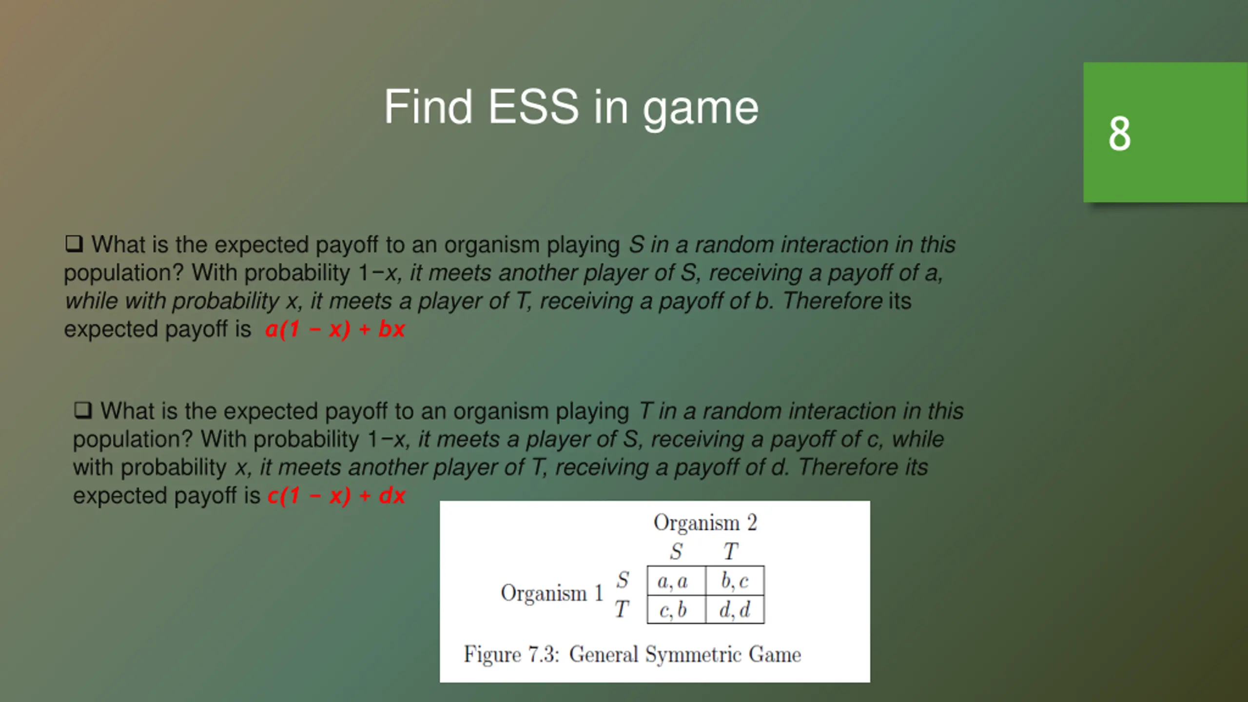 Find ESS in game 8 What is the expected payoff to an organism playing S in a random interaction in this population? With probability 1 x, it meets another player of S, receiving a payoff of a, while with probability x, it meets a player of T, receiving a payoff of b. Therefore its expected payoff is a(1 x) + bx What is the expected payoff to an organism playing T in a random interaction in this population? With probability 1 x, it meets a player of S, receiving a payoff of c, while with probability x, it meets another player of T, receiving a payoff of d. Therefore its expected payoff is c(1 x) + dx