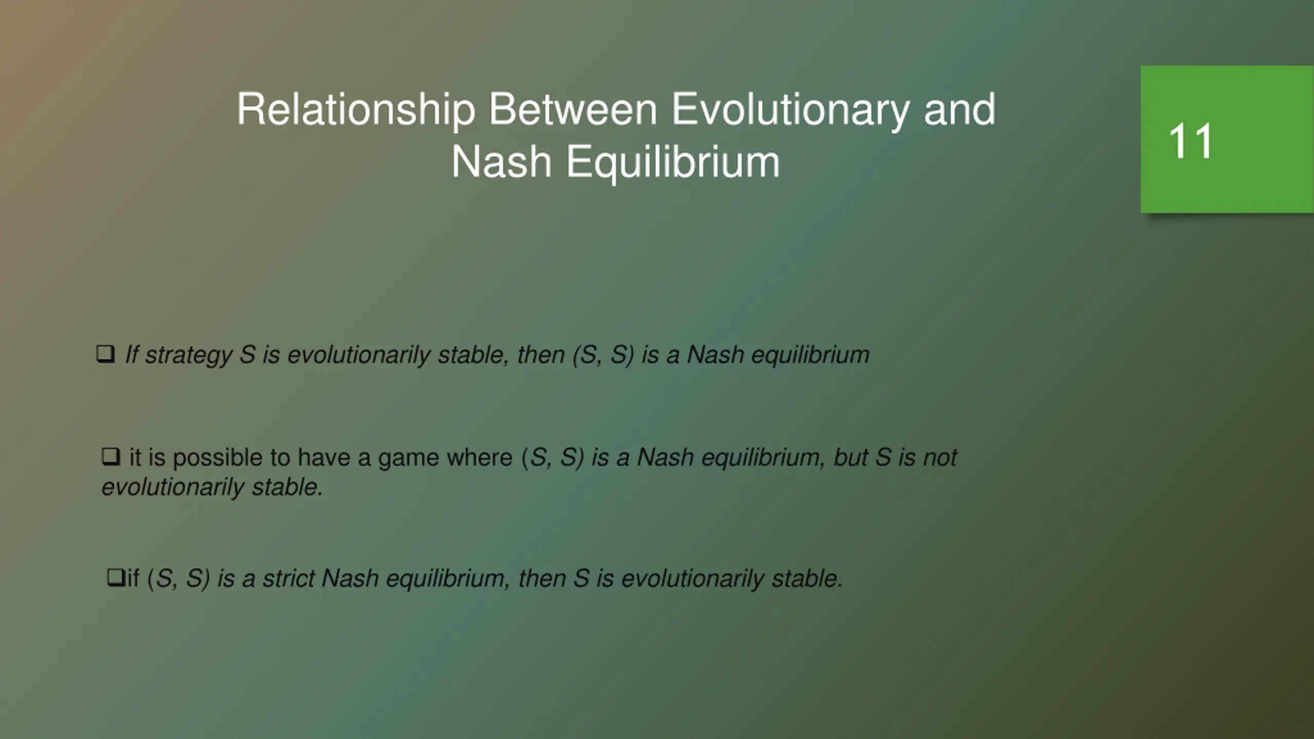 Relationship Between Evolutionary and Nash Equilibrium 11 If strategy S is evolutionarily stable, then (S, S) is a Nash equilibrium it is possible to have a game where (S, S) is a Nash equilibrium, but S is not evolutionarily stable. if (S, S) is a strict Nash equilibrium, then S is evolutionarily stable.