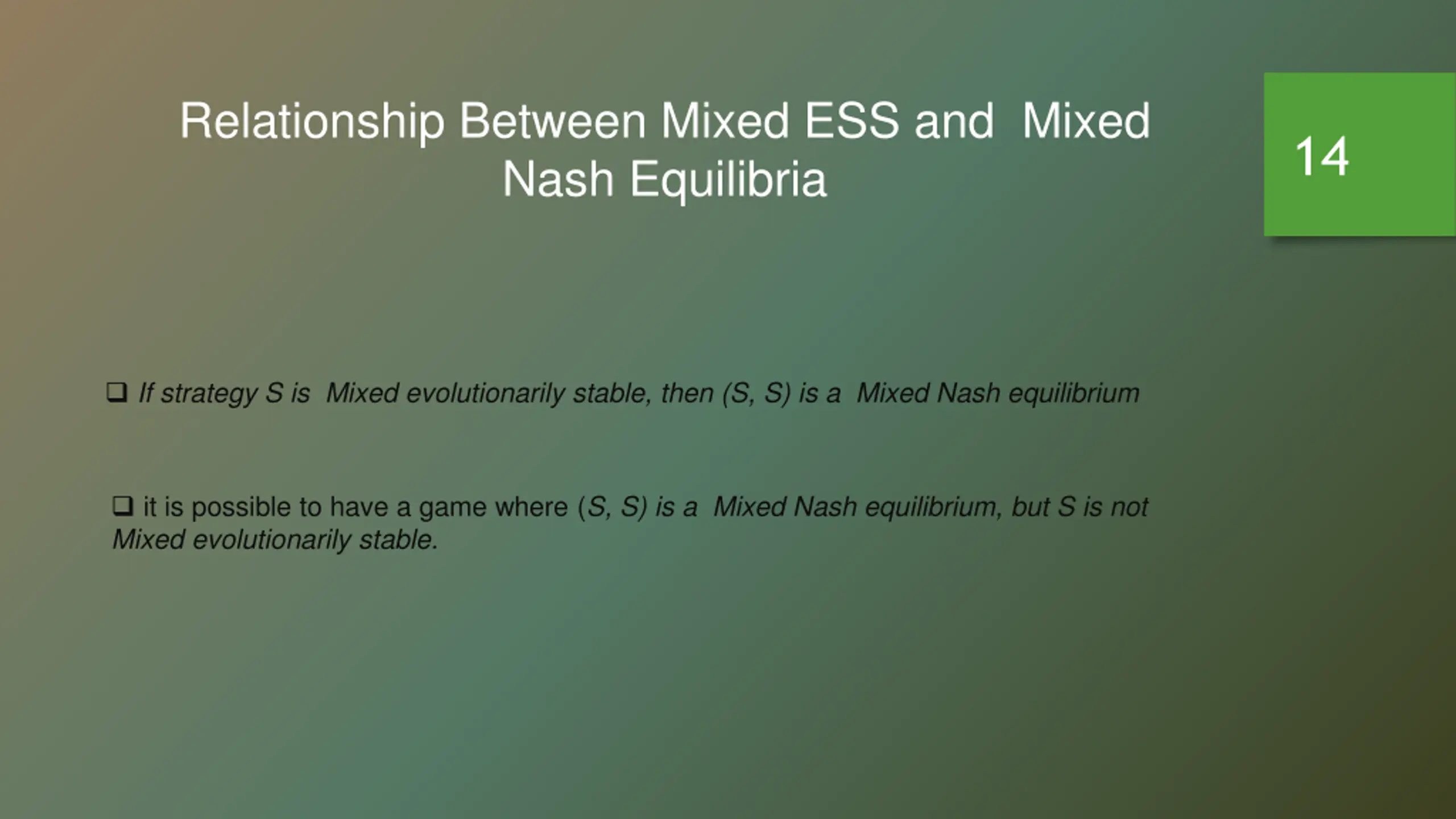 Relationship Between Mixed ESS and Mixed Nash Equilibria 14 If strategy S is Mixed evolutionarily stable, then (S, S) is a Mixed Nash equilibrium it is possible to have a game where (S, S) is a Mixed Nash equilibrium, but S is not Mixed evolutionarily stable.