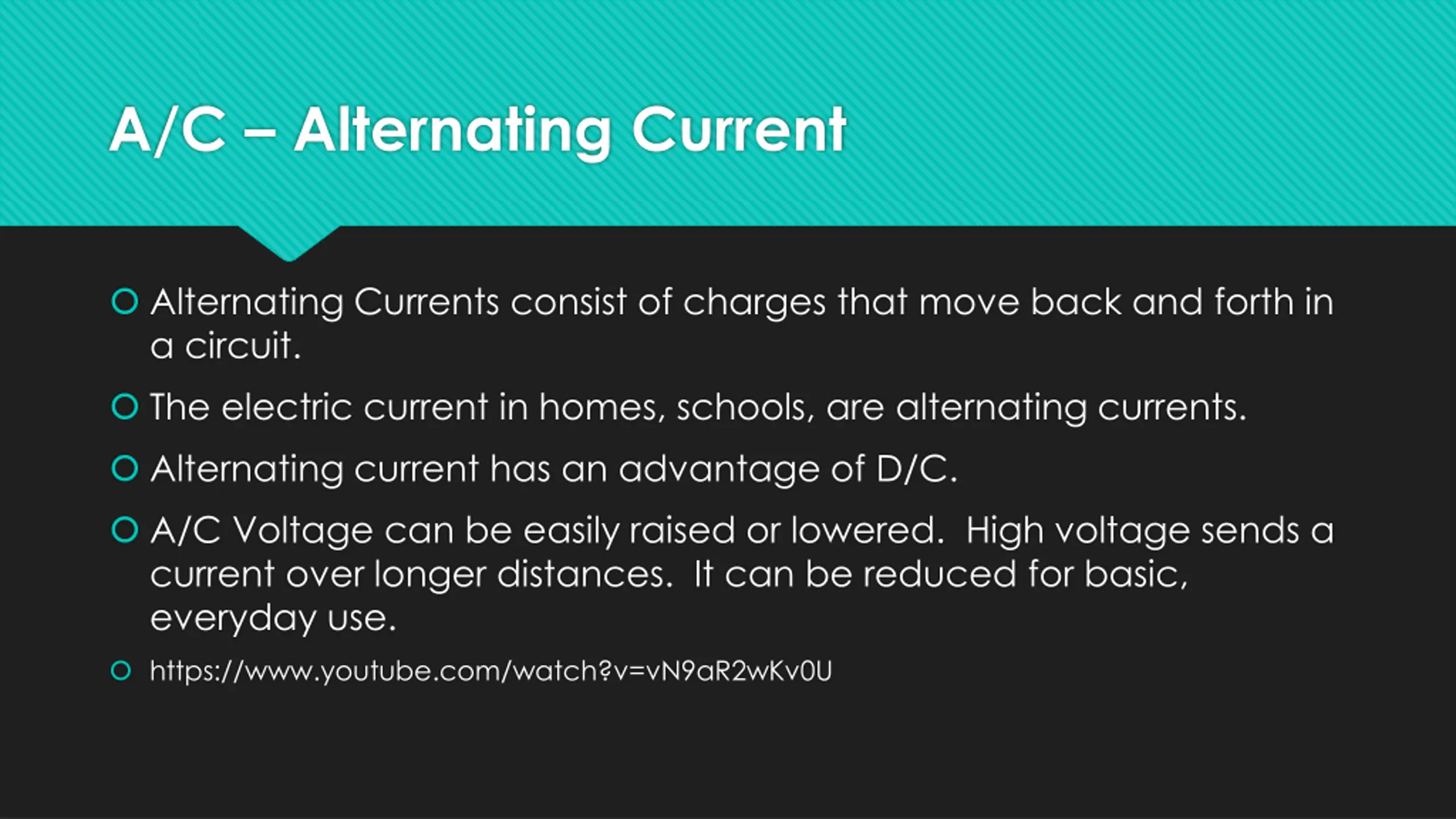 A/C Alternating Current Alternating Currents consist of charges that move back and forth in a circuit. The electric current in homes, schools, are alternating currents. Alternating current has an advantage of D/C. A/C Voltage can be easily raised or lowered. High voltage sends a current over longer distances. It can be reduced for basic, everyday use. https://www.youtube.com/watch?v=vN9aR2wKv0U