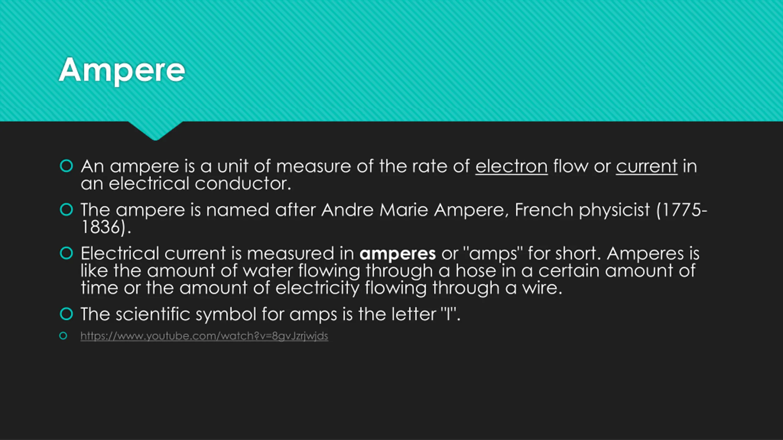 Ampere An ampere is a unit of measure of the rate of electron flow or current in an electrical conductor. The ampere is named after Andre Marie Ampere, French physicist (1775- 1836). Electrical current is measured in amperes or "amps" for short. Amperes is like the amount of water flowing through a hose in a certain amount of time or the amount of electricity flowing through a wire. The scientific symbol for amps is the letter "I". https://www.youtube.com/watch?v=8gvJzrjwjds