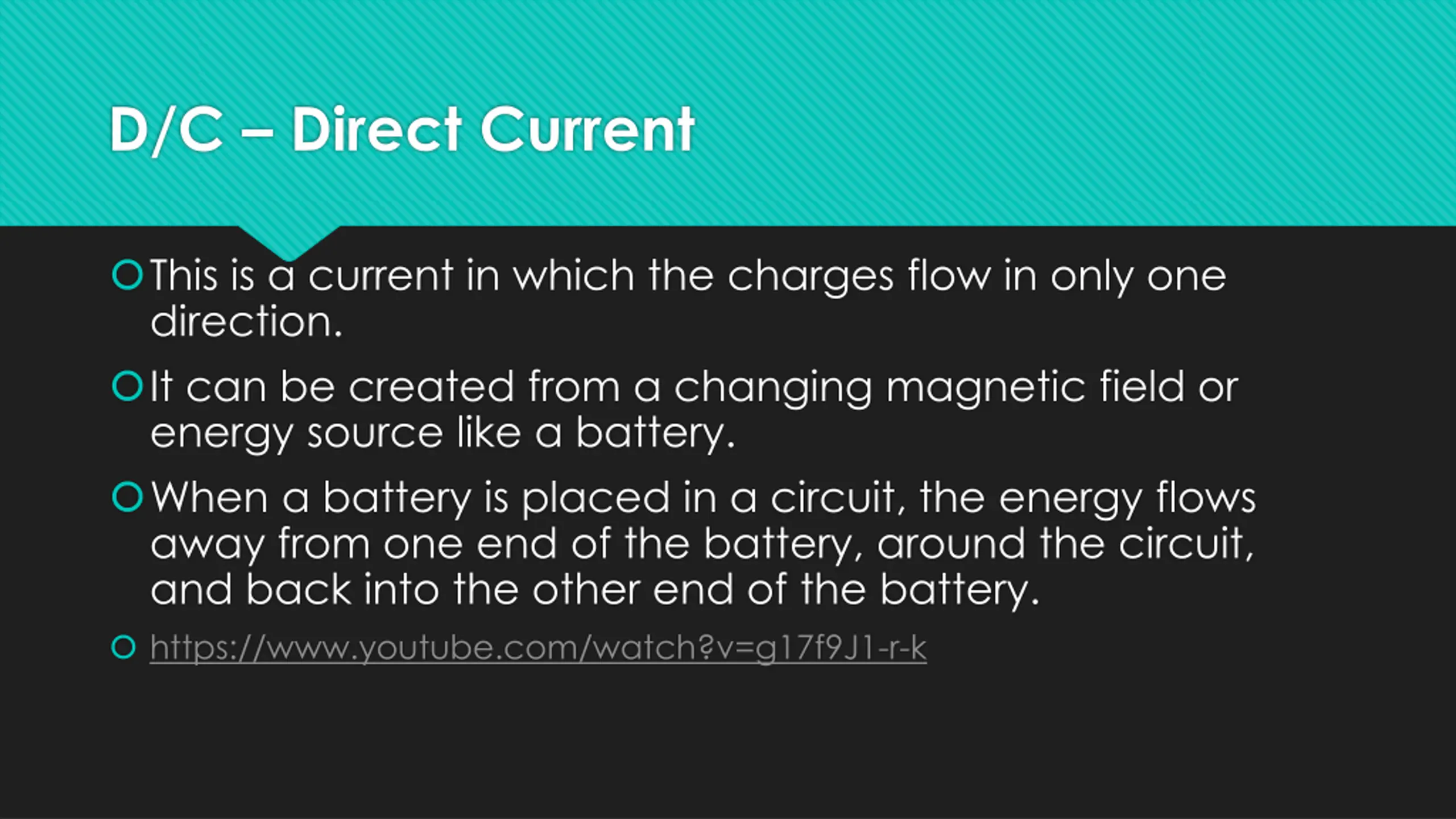 D/C Direct Current This is a current in which the charges flow in only one direction. It can be created from a changing magnetic field or energy source like a battery. When a battery is placed in a circuit, the energy flows away from one end of the battery, around the circuit, and back into the other end of the battery. https://www.youtube.com/watch?v=g17f9J1-r-k