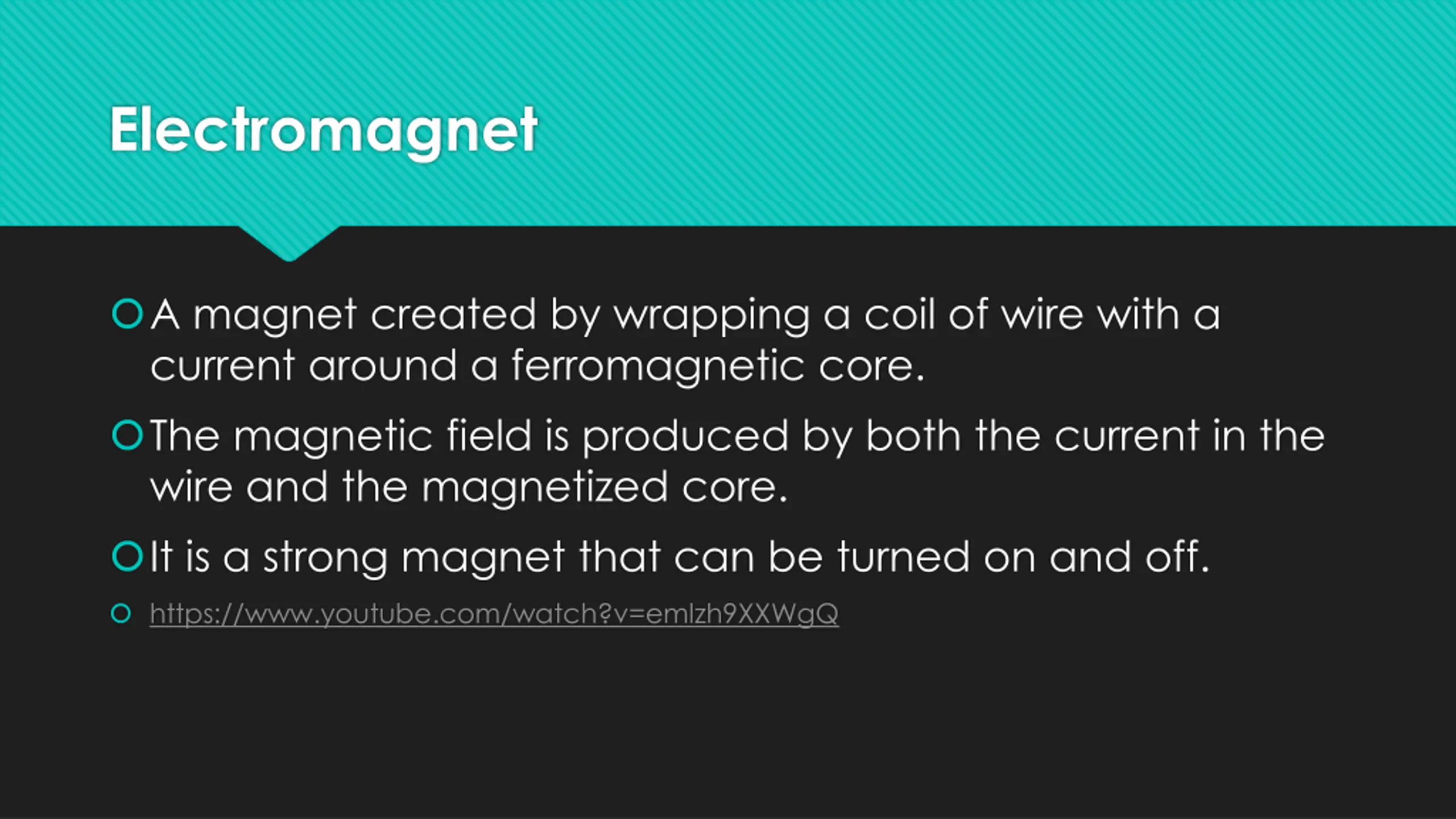 Electromagnet A magnet created by wrapping a coil of wire with a current around a ferromagnetic core. The magnetic field is produced by both the current in the wire and the magnetized core. It is a strong magnet that can be turned on and off. https://www.youtube.com/watch?v=emlzh9XXWgQ