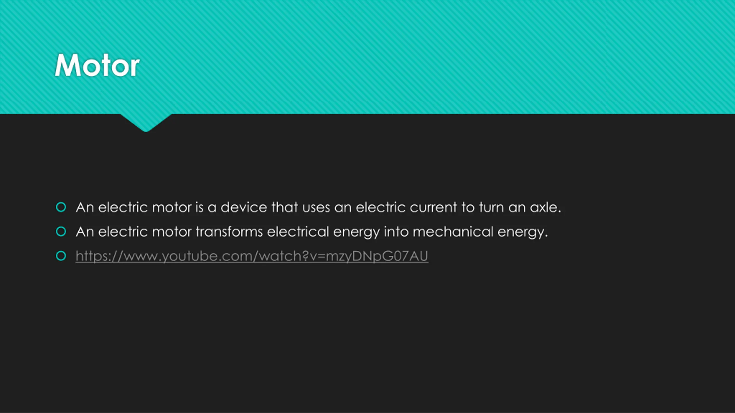 Motor An electric motor is a device that uses an electric current to turn an axle. An electric motor transforms electrical energy into mechanical energy. https://www.youtube.com/watch?v=mzyDNpG07AU