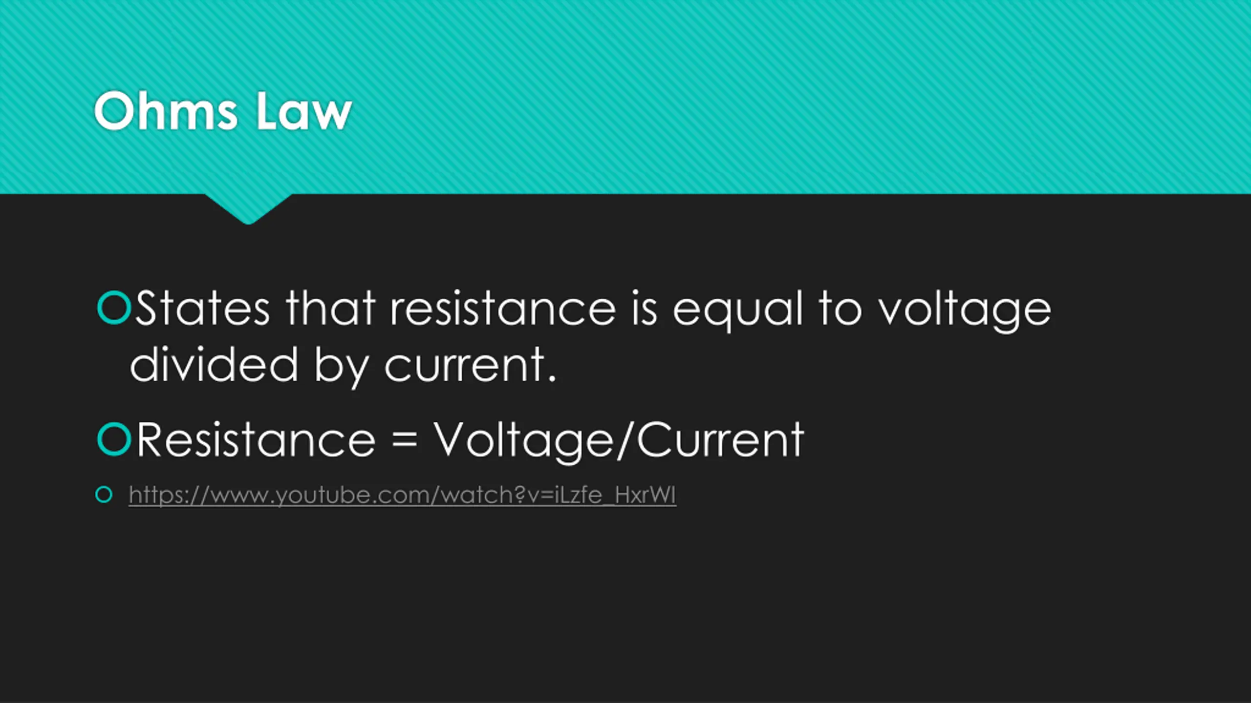 Ohms Law States that resistance is equal to voltage divided by current. Resistance = Voltage/Current https://www.youtube.com/watch?v=iLzfe_HxrWI