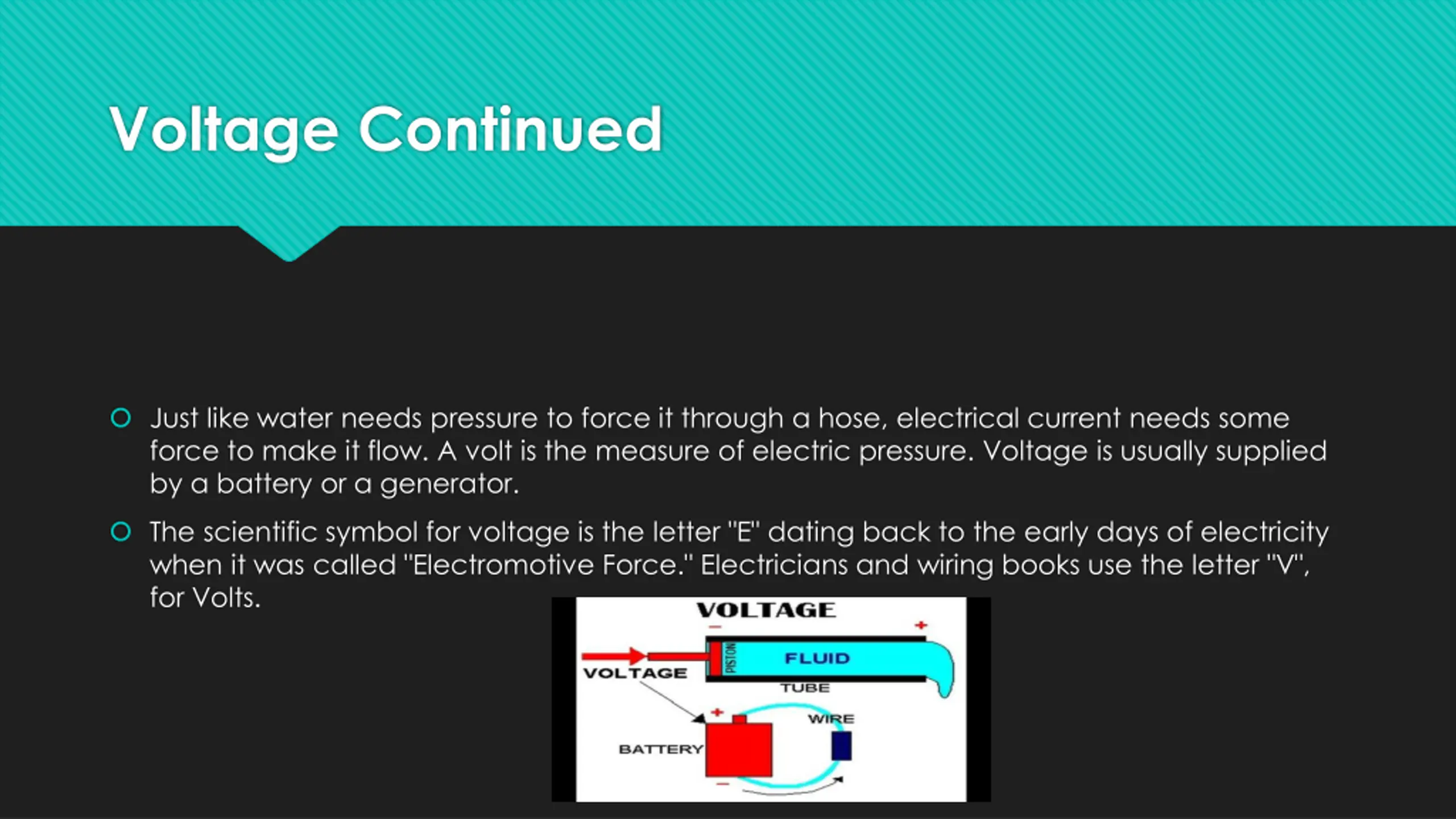 Voltage Continued Just like water needs pressure to force it through a hose, electrical current needs some force to make it flow. A volt is the measure of electric pressure. Voltage is usually supplied by a battery or a generator. The scientific symbol for voltage is the letter "E" dating back to the early days of electricity when it was called "Electromotive Force." Electricians and wiring books use the letter "V", for Volts.